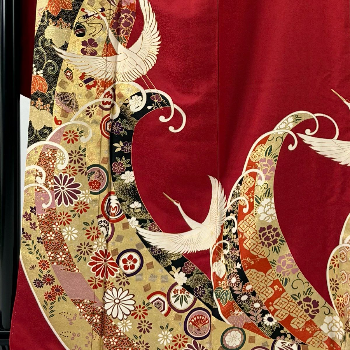 振袖 身丈161cm 裄丈65cm M 袷 鶴 枝垂れ桜 金通し 金銀彩 赤茶 正絹 名品