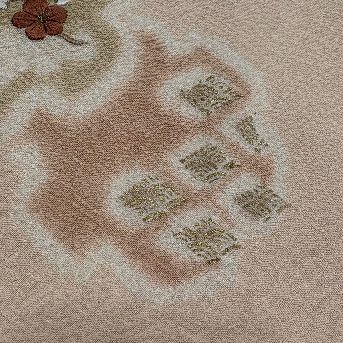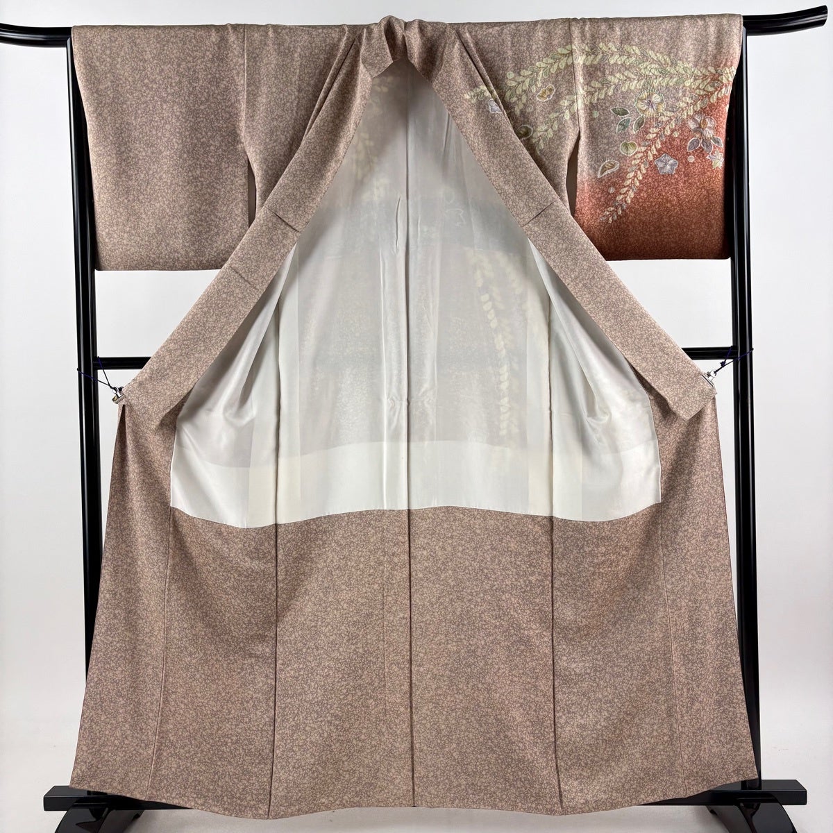 訪問着 身丈157cm 裄丈62.5cm S 袷 草花 鳥 刺繍 ぼかし 薄茶色 正絹 秀品 一つ紋