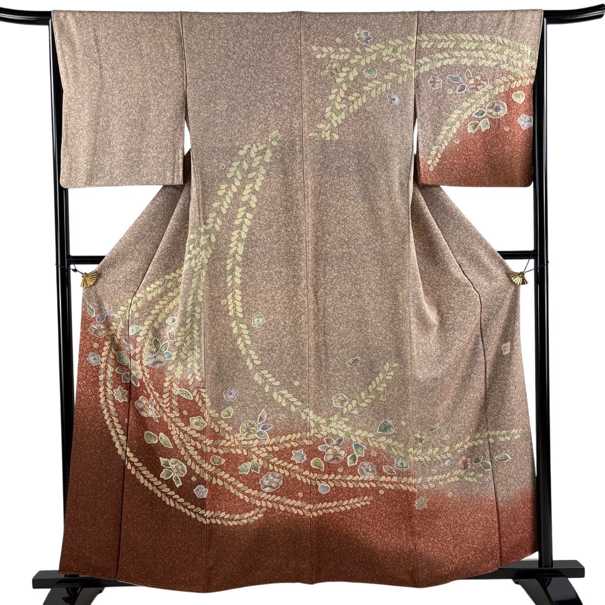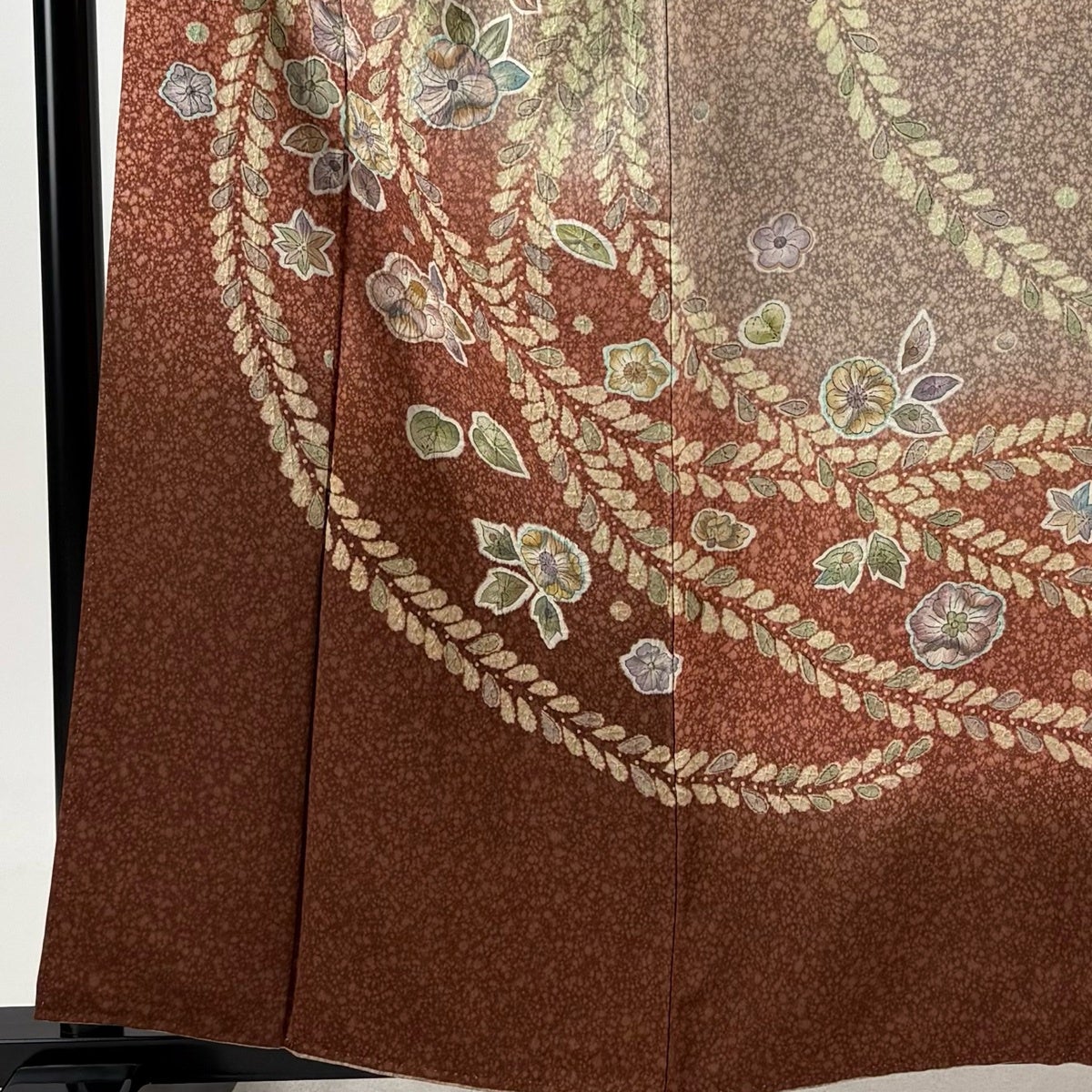 訪問着 身丈163cm 裄丈68.5cm L 袷 草花 幾何学 金彩 絞り 茶色 正絹 秀品 一つ紋