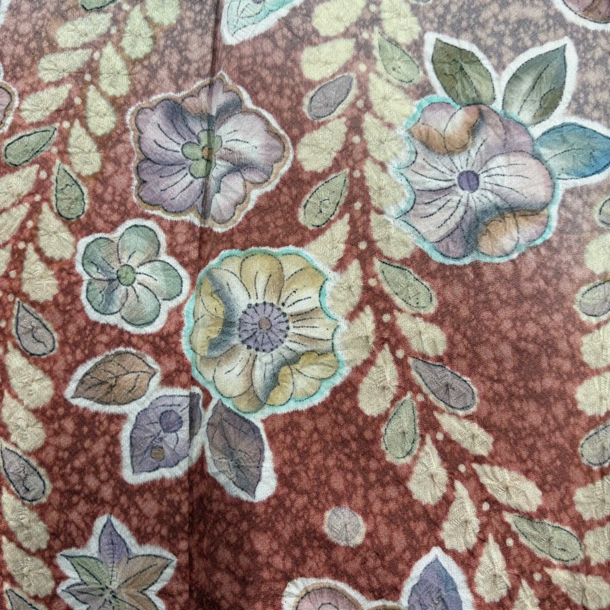 小紋 身丈160cm 裄丈66.5cm M 袷 南部幸雄 落款あり 笹 草花 縮緬 小豆色 正絹 秀品