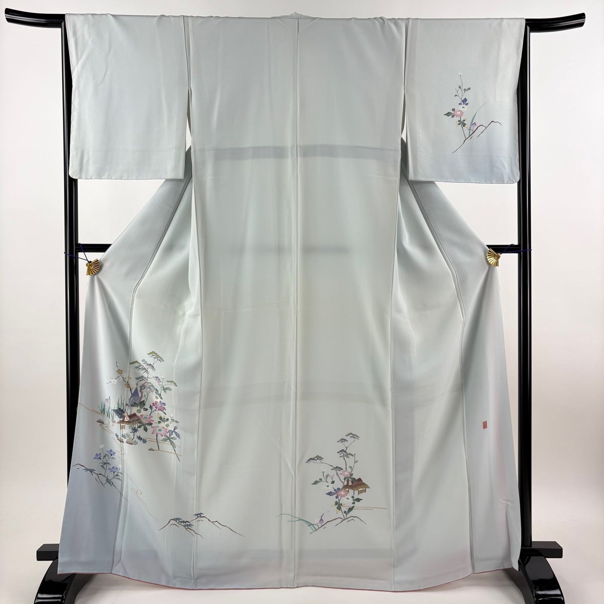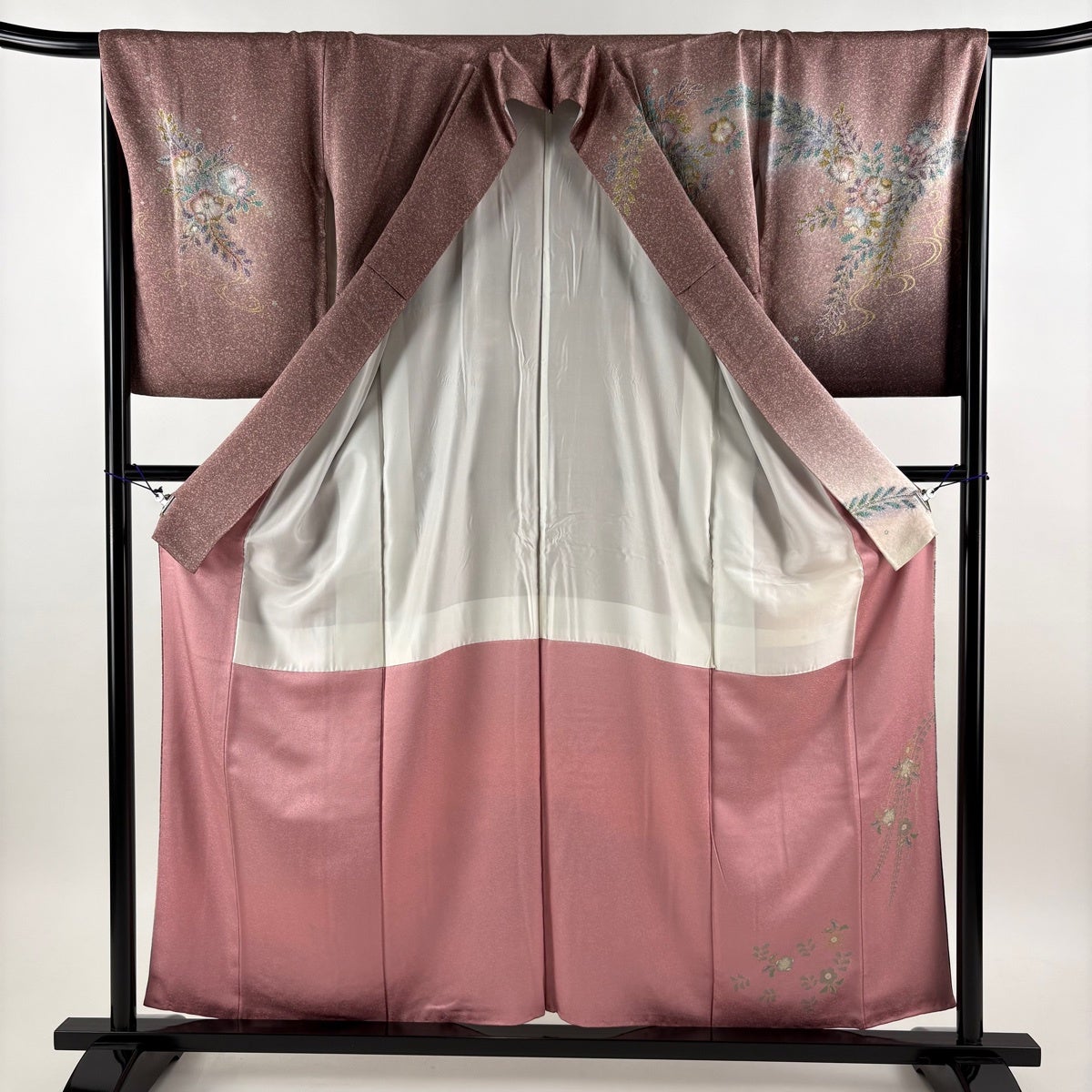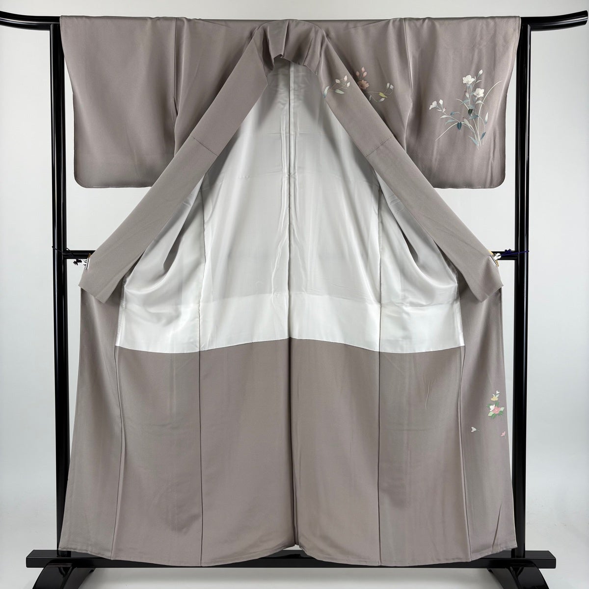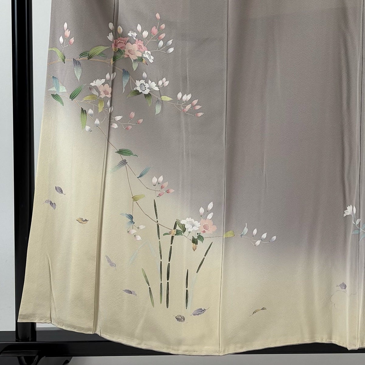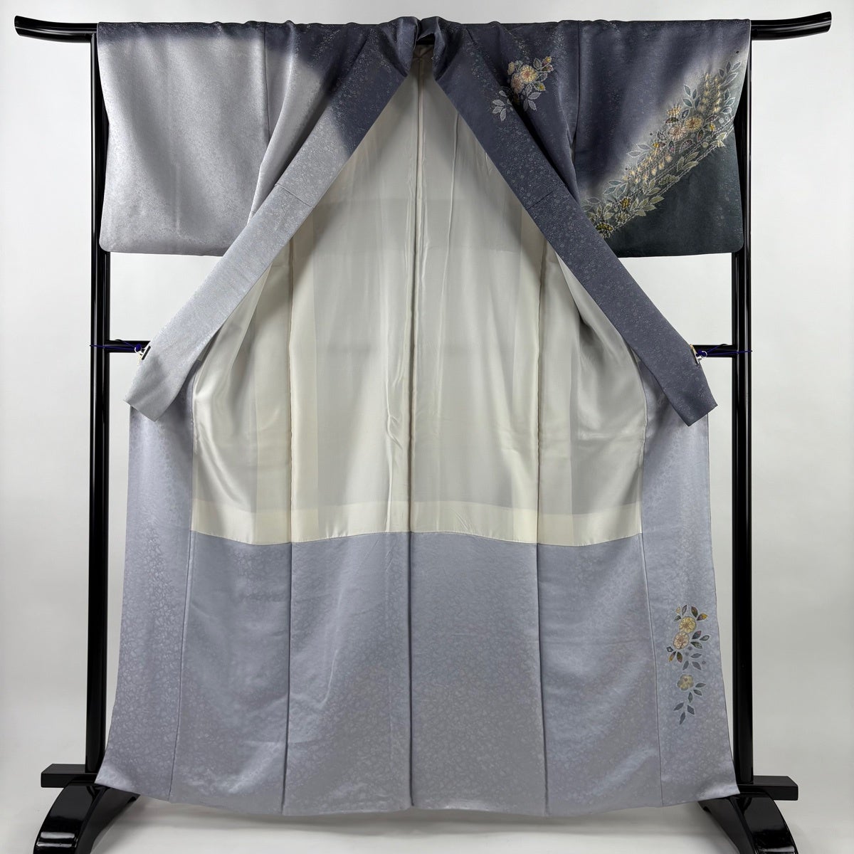 付下げ 身丈162.5cm 裄丈66cm M 袷 落款あり 尾長鳥 草花 金銀彩 ぼかし 灰色 正絹 名品