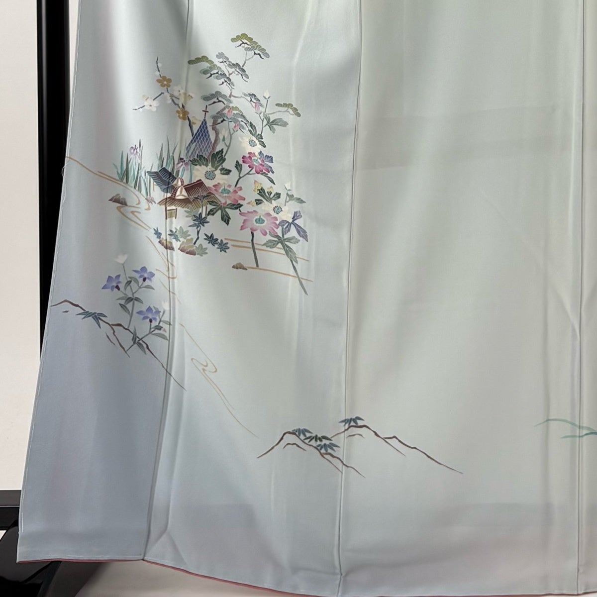 訪問着 身丈161.5cm 裄丈67cm M 袷 きぬたや謹製 波 幾何学模様 ぼかし 青灰色 正絹 逸品