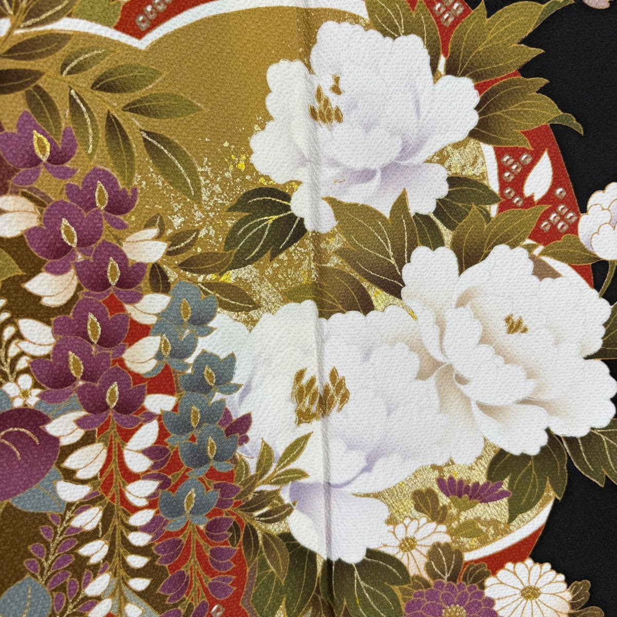 振袖 身丈158.5cm 裄丈64cm M 袷 袋帯フルセット 鼓 牡丹 金彩 ぼかし 黄土色 正絹 秀品