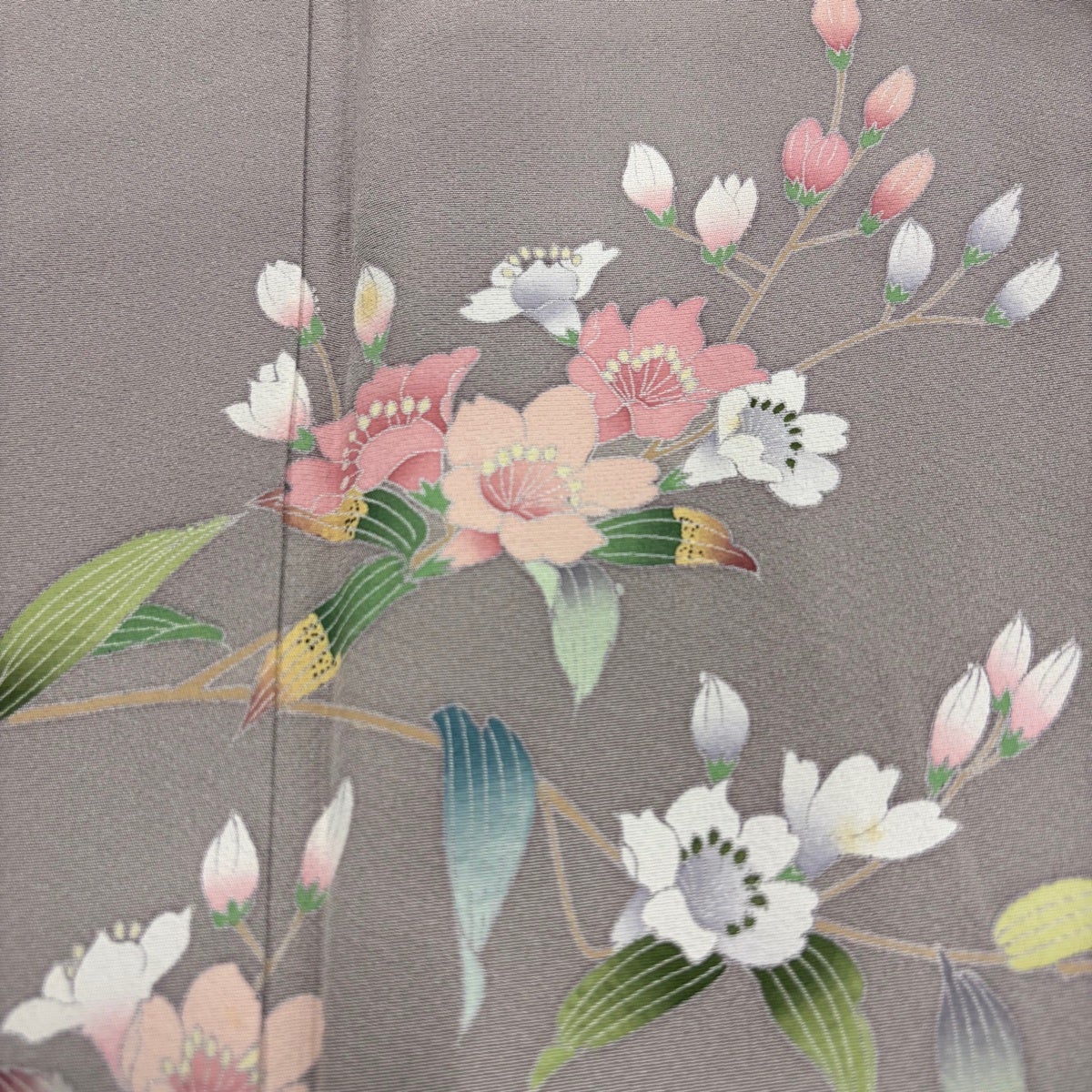 訪問着 身丈163cm 裄丈66cm M 袷 和田光正 落款あり 椿 枝梅 金彩 ぼかし 灰色 正絹 名品