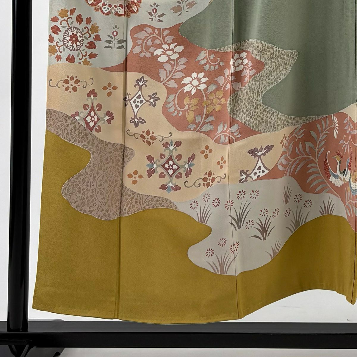【美品】 付下げ 身丈153cm 裄丈60.5cm S 袷 華文 七宝 刺繍 染め分け 茶緑色 正絹 名品
