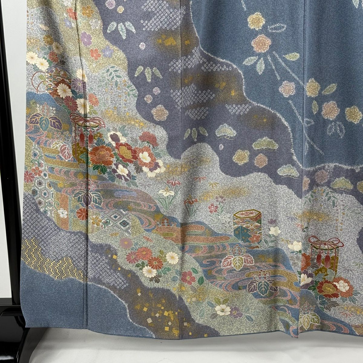 訪問着 身丈162.5cm 裄丈68cm L 袷 阿部佳雪 落款あり 草花 曲垣 ぼかし 青灰色 正絹 秀品