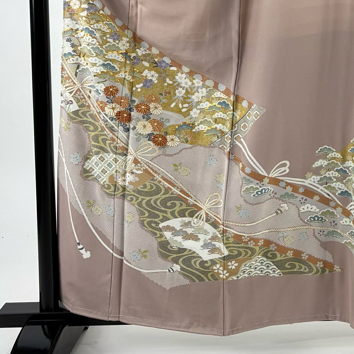 付下げ 身丈158cm 裄丈65cm M 袷 松尾光琳 落款あり 扇 人物 金銀彩 灰緑 正絹 秀品 一つ紋