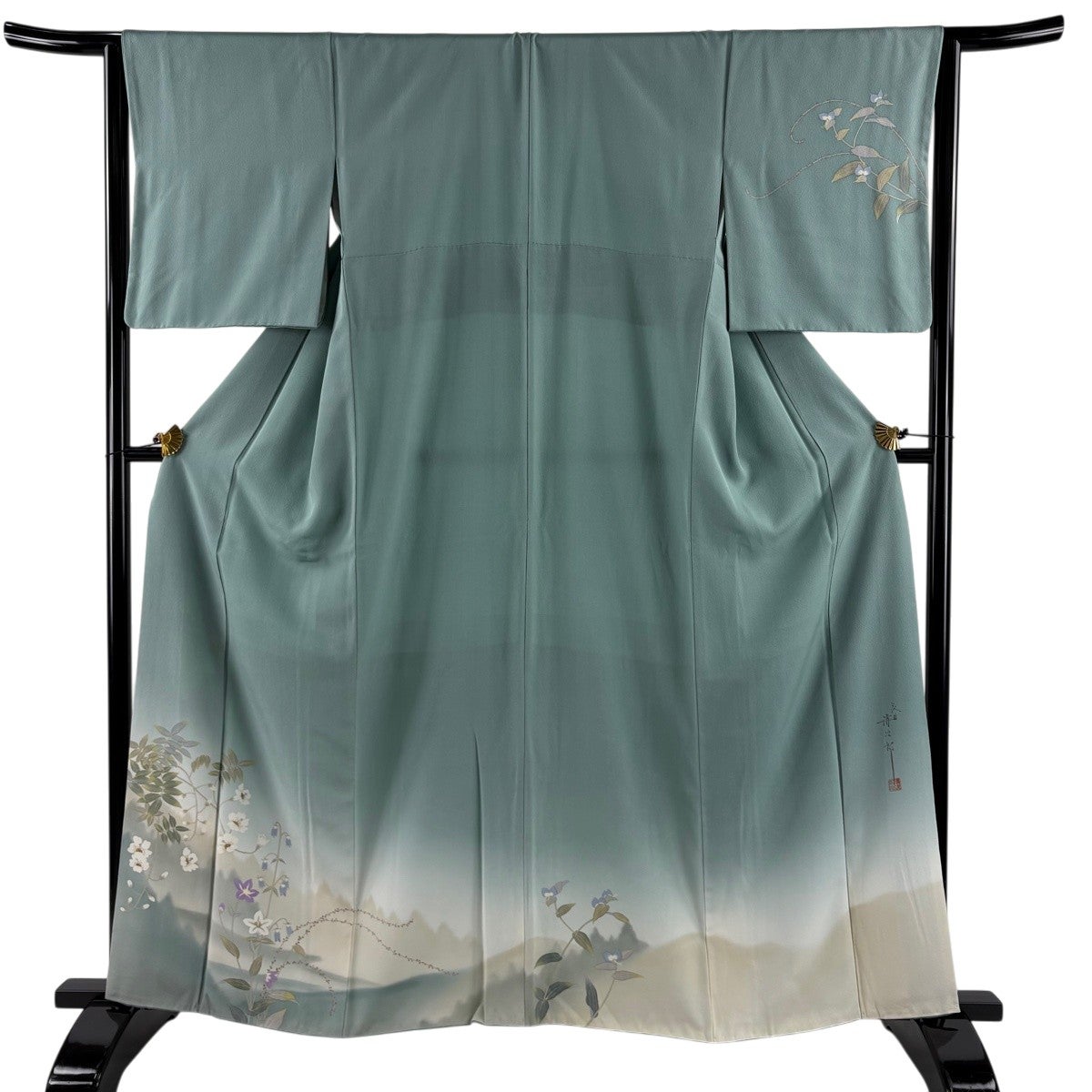 訪問着 身丈160cm 裄丈62.5cm S 袷 落款あり 秋草 蔦 金彩 ぼかし 青灰色 正絹 秀品 一つ紋