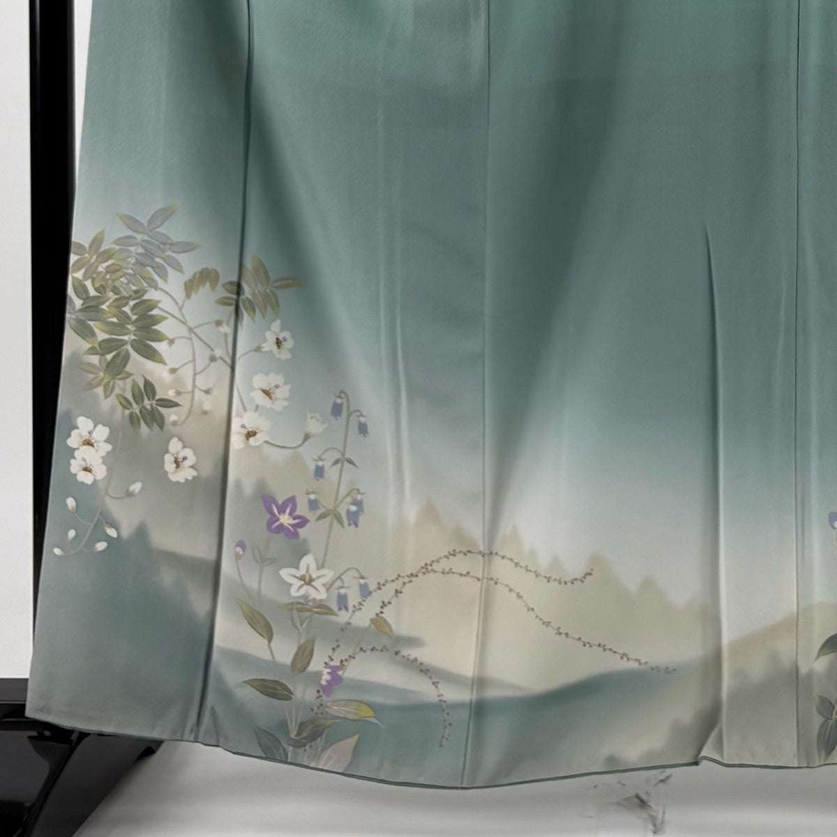色留袖 身丈152.5cm 裄丈61cm S 袷 落款あり 鳥 草花 金銀糸 ぼかし 薄緑 正絹 秀品 一つ紋