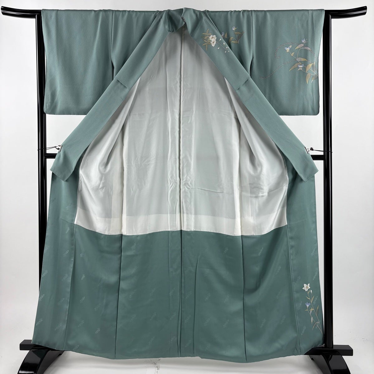 【美品】 付下げ 身丈152.5cm 裄丈62cm S 袷 草花 宝尽くし 金銀糸 刺繍 よもぎ色 正絹 秀品