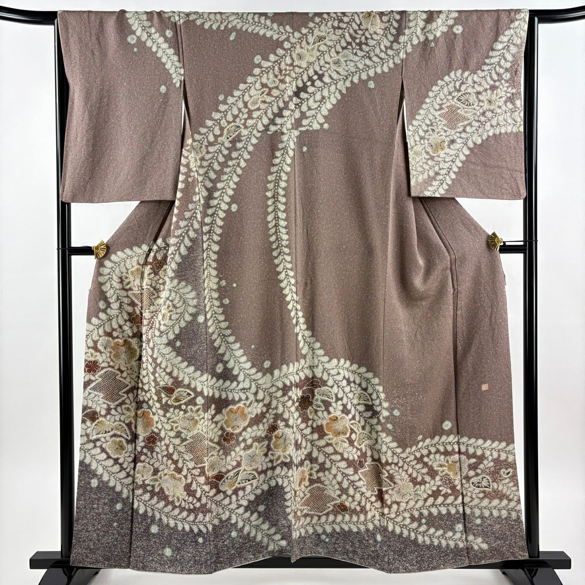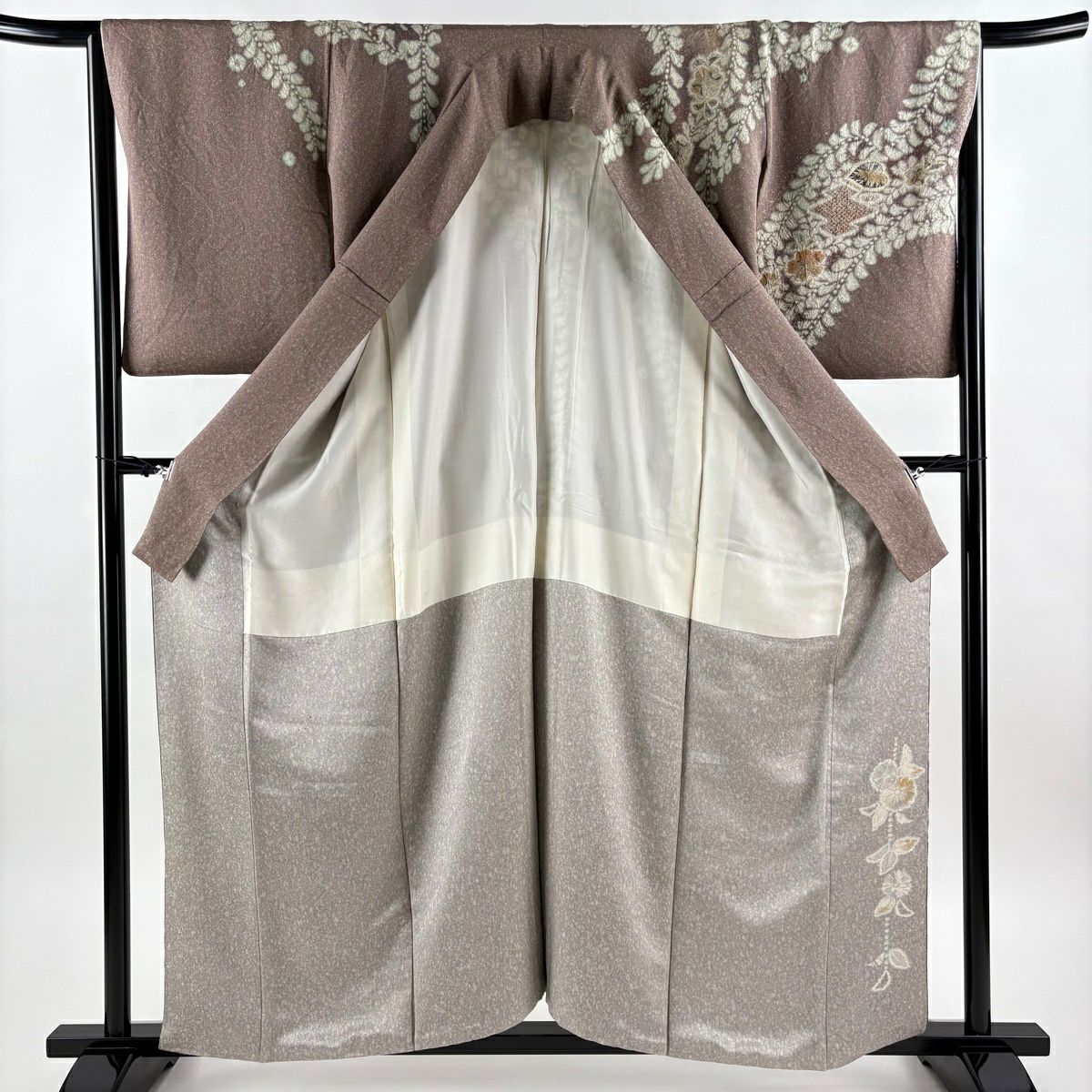 振袖 身丈163cm 裄丈66cm M 袷 宮崎良次 落款あり 草花 流水 染め分け ぼかし 焦茶色 正絹 名品