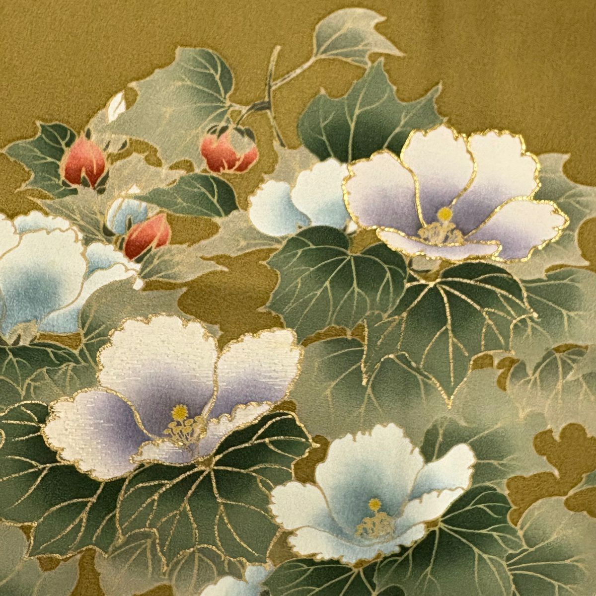 付下げ 身丈155.5cm 裄丈61.5cm S 袷 辻村ジュサブロー 落款あり 花びら 金彩 灰緑 正絹 名品 一つ紋