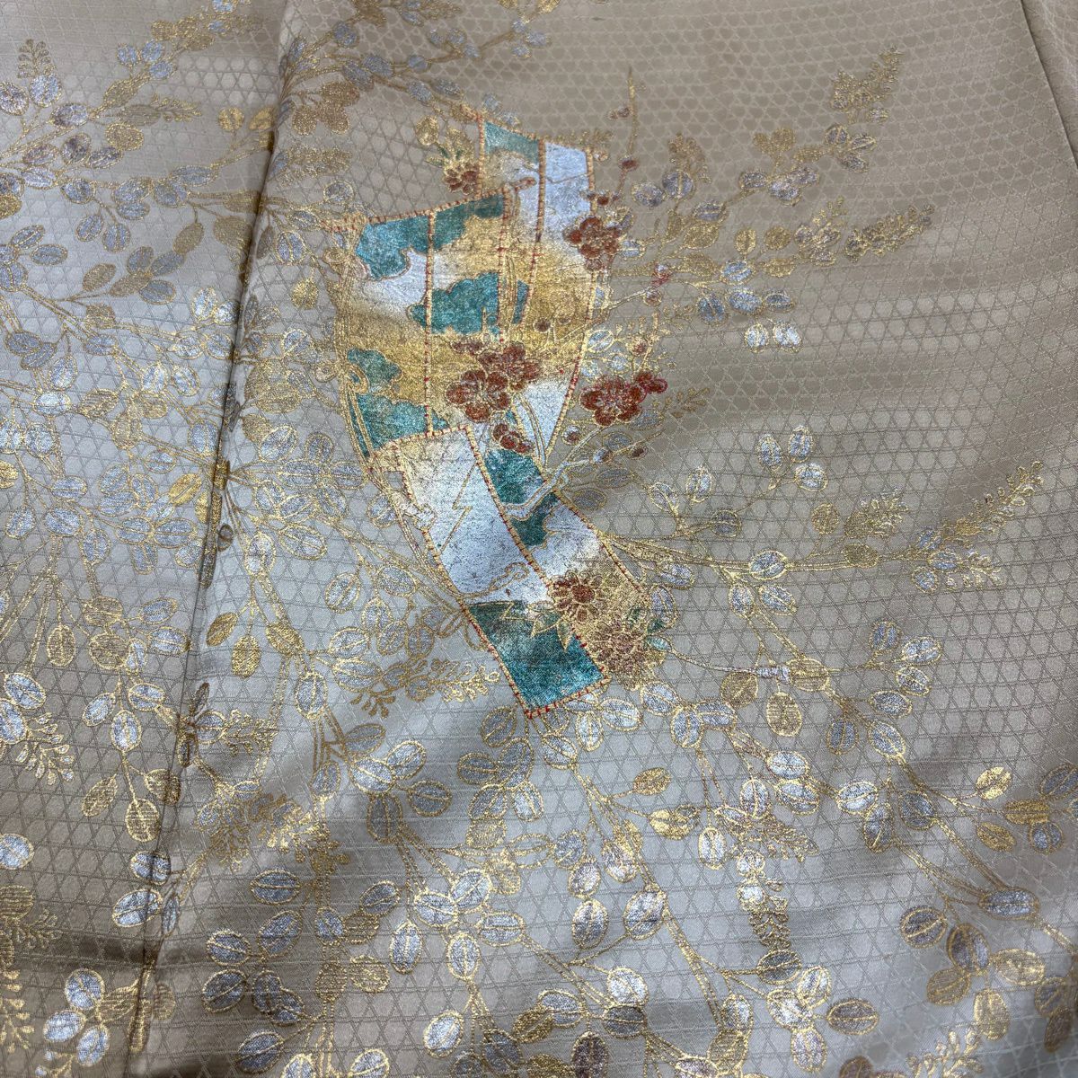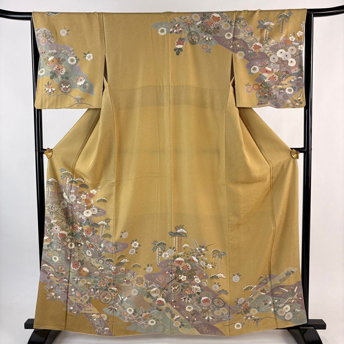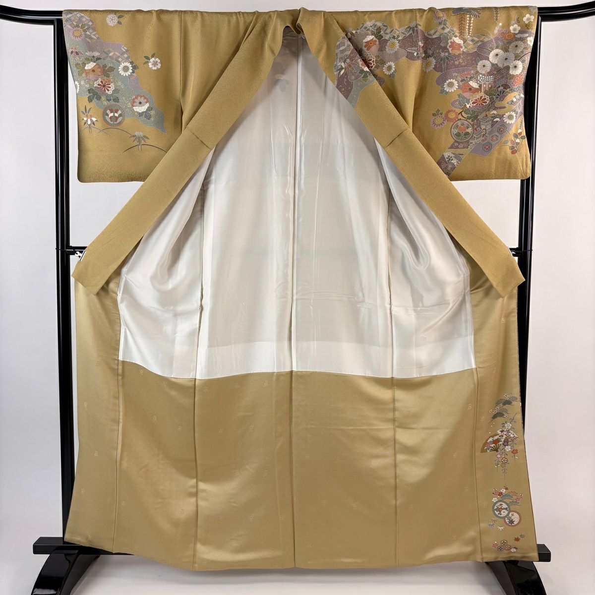 他の画像を見る 【最終値引き】 70%OFF 付下げ 身丈164cm 裄丈67.5cm L 袷 扇面 草花 螺鈿 金銀彩 黄土色 正絹 名品 K70 当店通常価格 ¥ 13,800 ¥ 4,140 税込