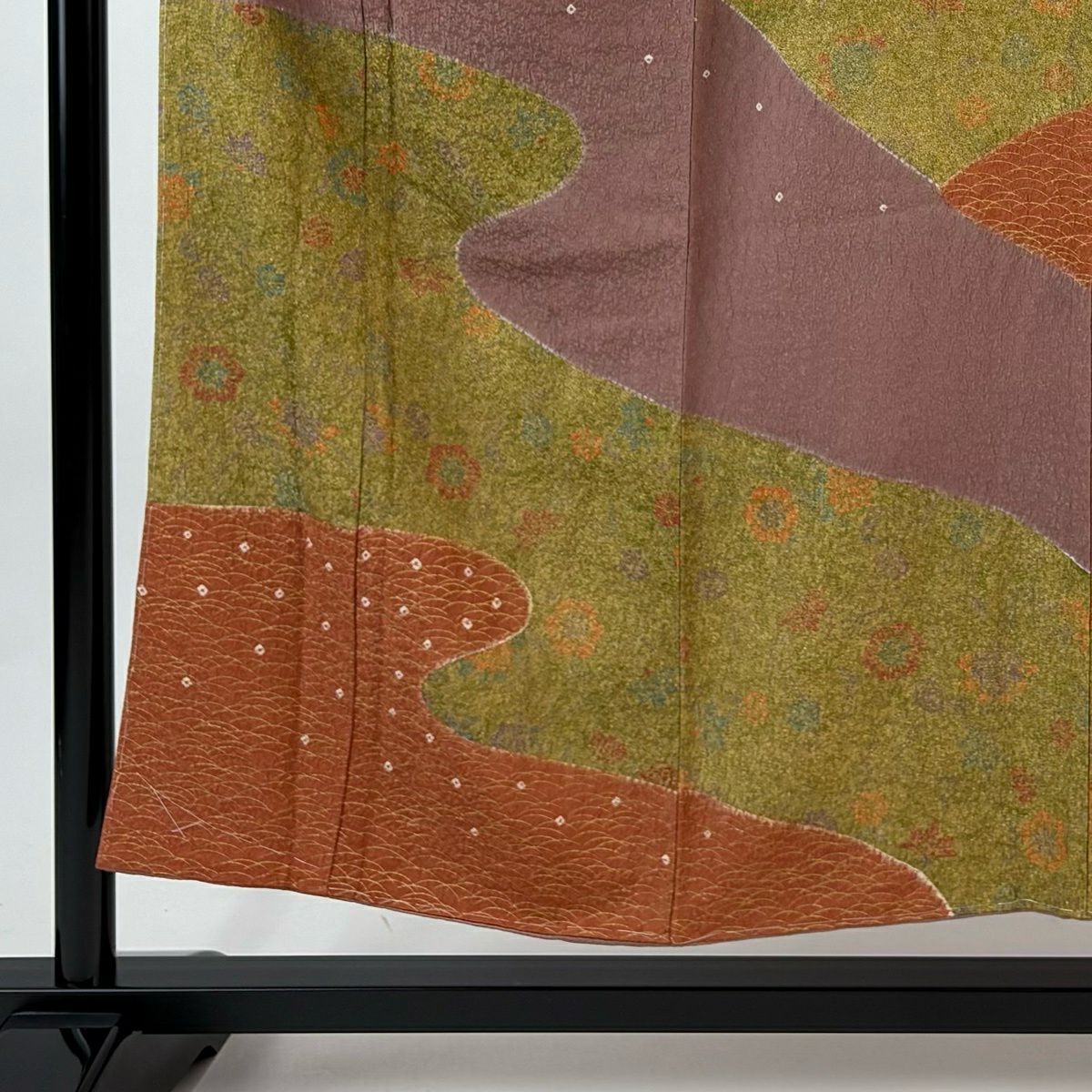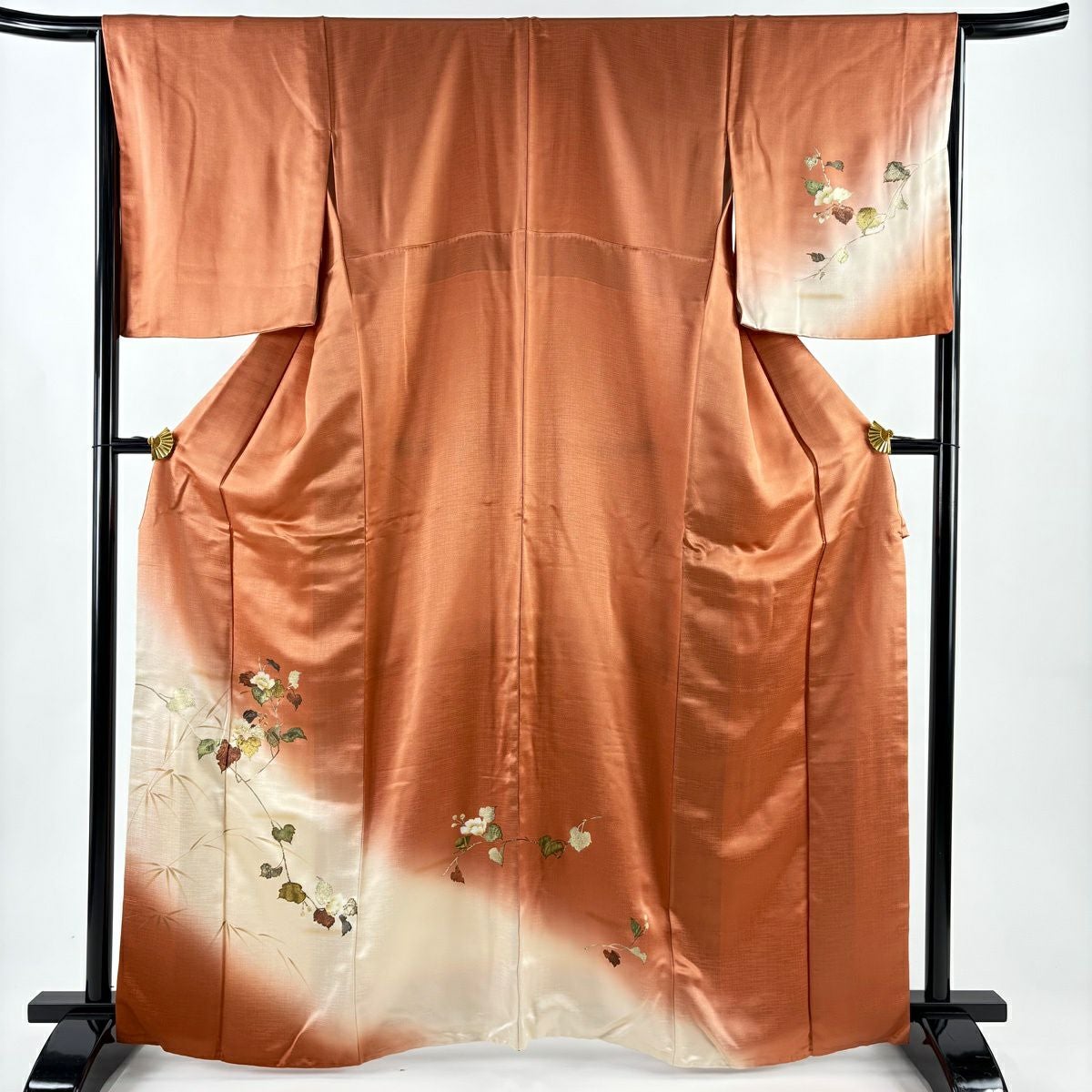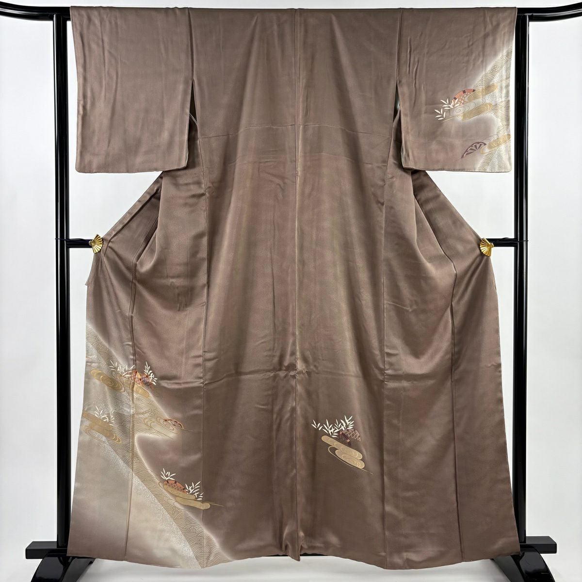 他の画像を見る 【最終値引き】 70%OFF 付下げ 身丈164cm 裄丈67.5cm L 袷 扇面 草花 螺鈿 金銀彩 黄土色 正絹 名品 K70 当店通常価格 ¥ 13,800 ¥ 4,140 税込