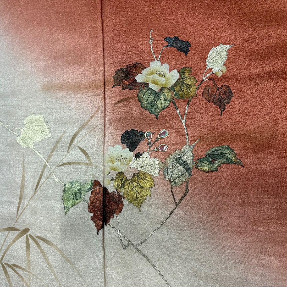 他の画像を見る 【最終値引き】 70%OFF 付下げ 身丈165cm 裄丈65cm M 袷 紬地 鳳凰 草花 金彩 染め分け 薄茶色 正絹 秀品 K70 当店通常価格 ¥ 6,800 ¥ 1,980 税込