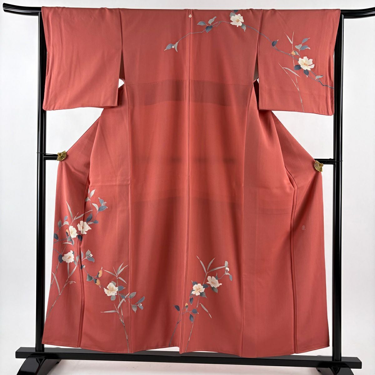 【美品】 付下げ 身丈159.5cm 裄丈62cm S 袷 百貫達雄 落款あり 草花 サーモンピンク 正絹 秀品 一つ紋