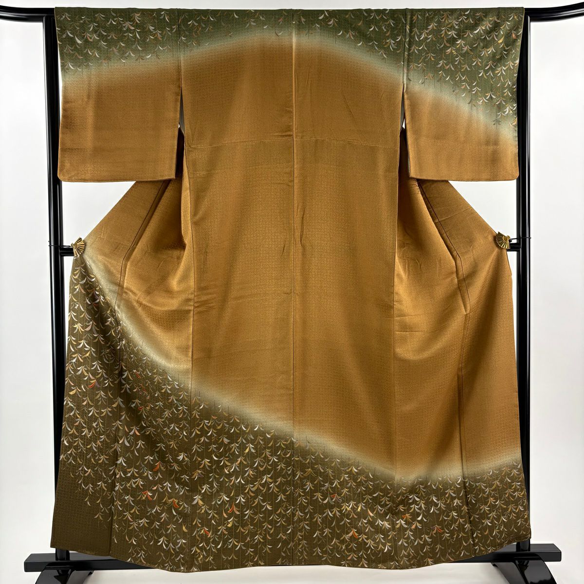 他の画像を見る 【最終値引き】 83%OFF 【美品】 訪問着 身丈159cm 裄丈63.5cm S 袷 葉柄 金糸 刺繍 山吹茶色 正絹 秀品 K70 当店通常価格 ¥ 11,800 ¥ 1,980 税込