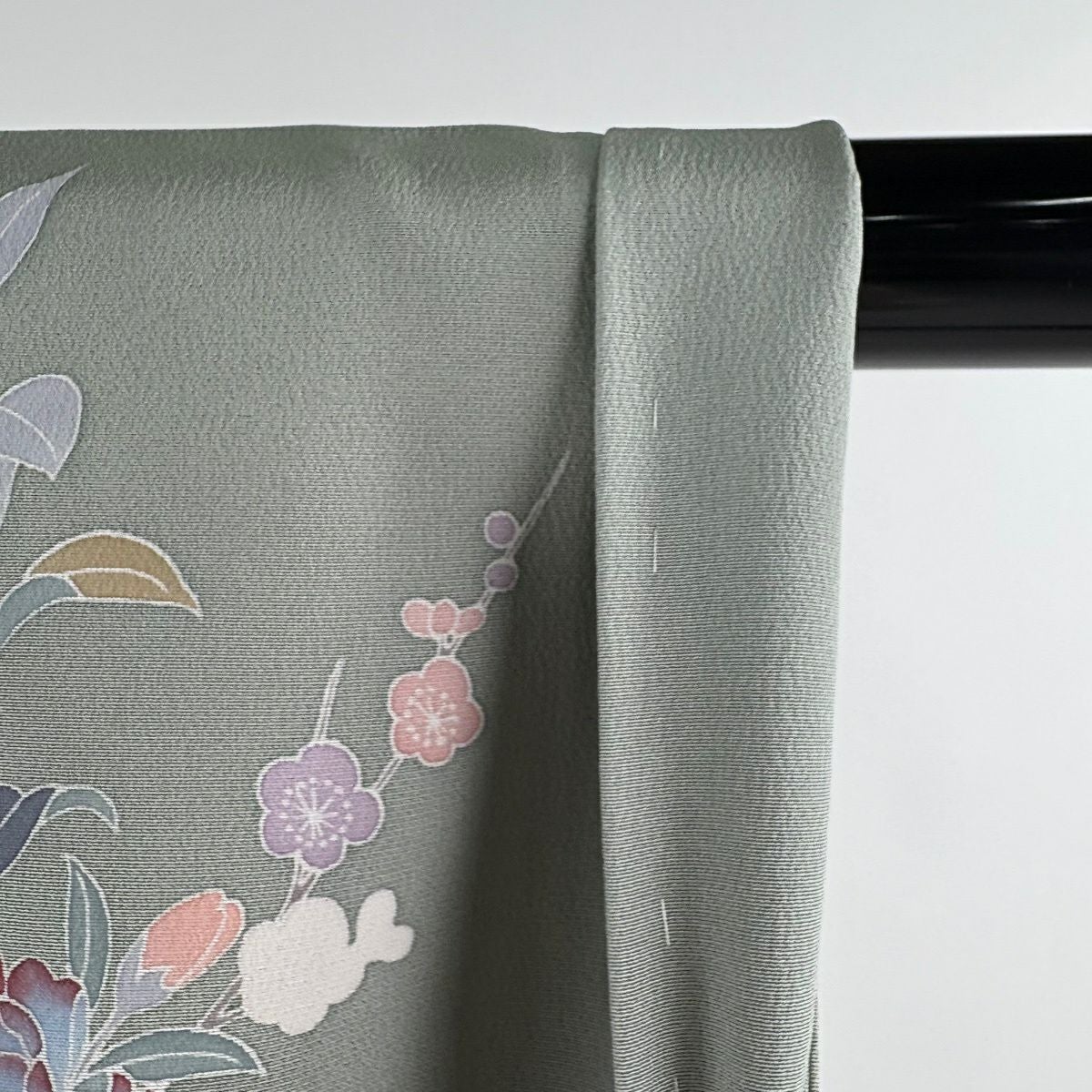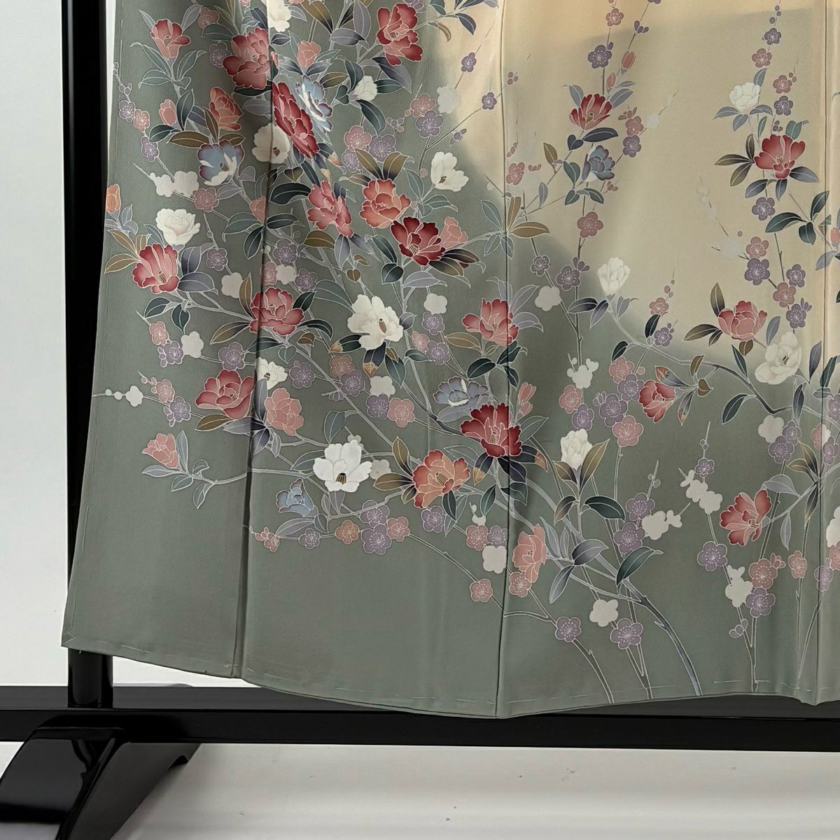 他の画像を見る 【最終値引き】 70%OFF 訪問着 身丈156cm 裄丈64.5cm M 袷 落款あり 椿 枝梅 染め分け 灰緑 正絹 逸品 K70 当店通常価格 ¥ 41,800 ¥ 12,540 税込