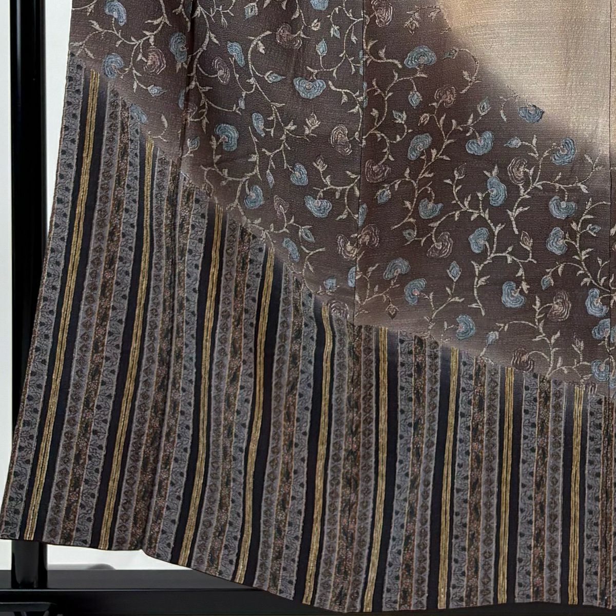 他の画像を見る 【最終値引き】 70%OFF 訪問着 身丈156.5cm 裄丈64cm M 袷 花唐草 縞 染め分け ぼかし 茶紫 正絹 名品 K70 当店通常価格 ¥ 15,800 ¥ 4,700 税込