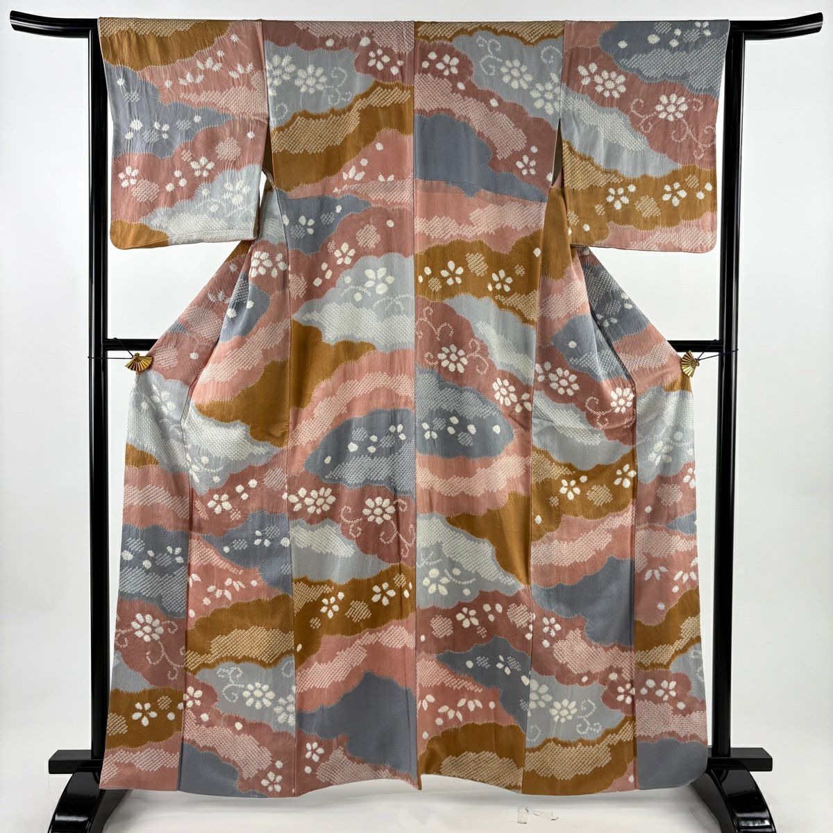 【在庫一掃】 訪問着 身丈156cm 裄丈64.5cm M 袷 落款あり 牡丹 流水 染め分け ぼかし ピンク 正絹 名品