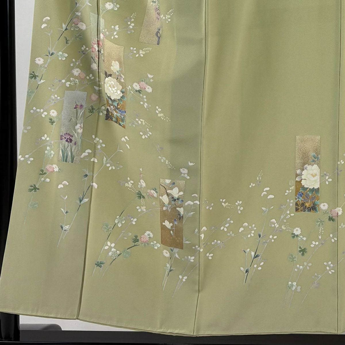 他の画像を見る 【最終値引き】 70%OFF 訪問着 身丈153cm 裄丈62cm S 袷 短冊 草花 金銀彩 刺繍 抹茶色 正絹 秀品 一つ紋 K70 当店通常価格 ¥ 6,800 ¥ 1,980 税込