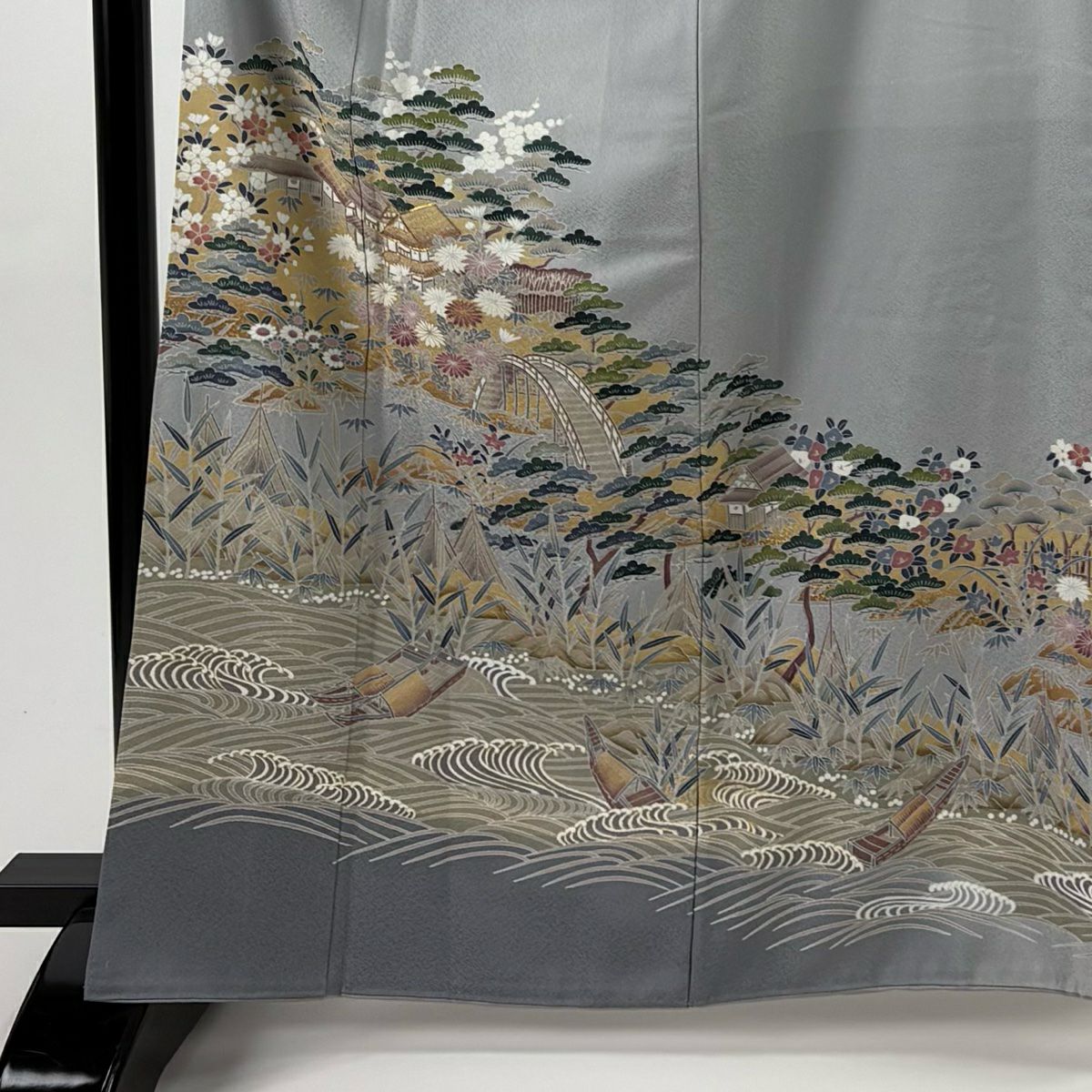 訪問着 身丈152cm 裄丈65cm M 絽袷 建物 樹木 金彩 青灰色 正絹 名品
