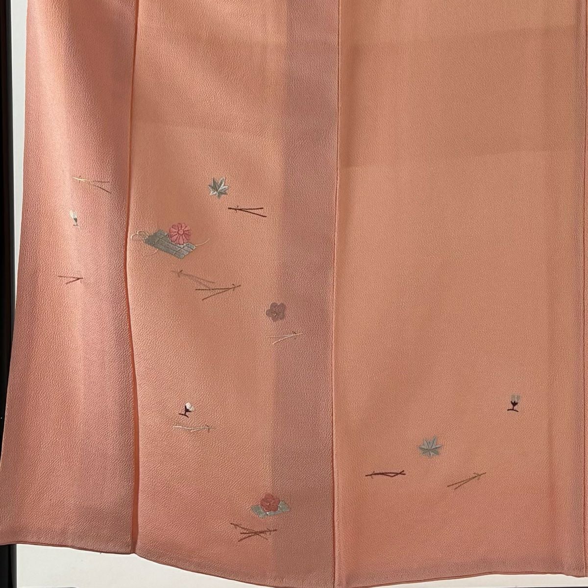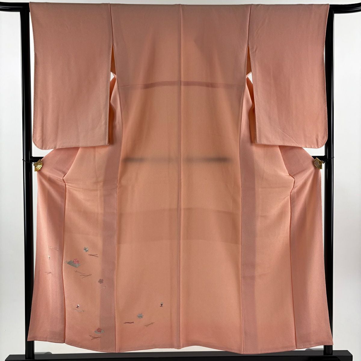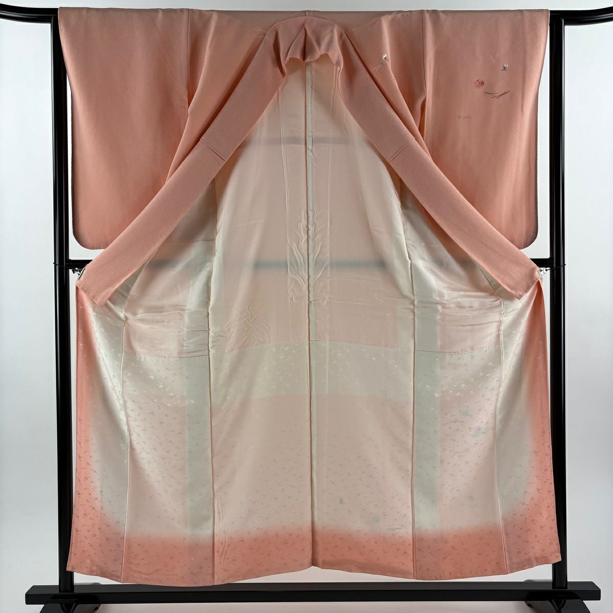 他の画像を見る 【最終値引き】 70%OFF 色無地 身丈161cm 裄丈66.5cm M 袷 地紋 サーモンピンク 正絹 美品 優品 一つ紋 K70 当店通常価格 ¥ 4,800 ¥ 1,440 税込