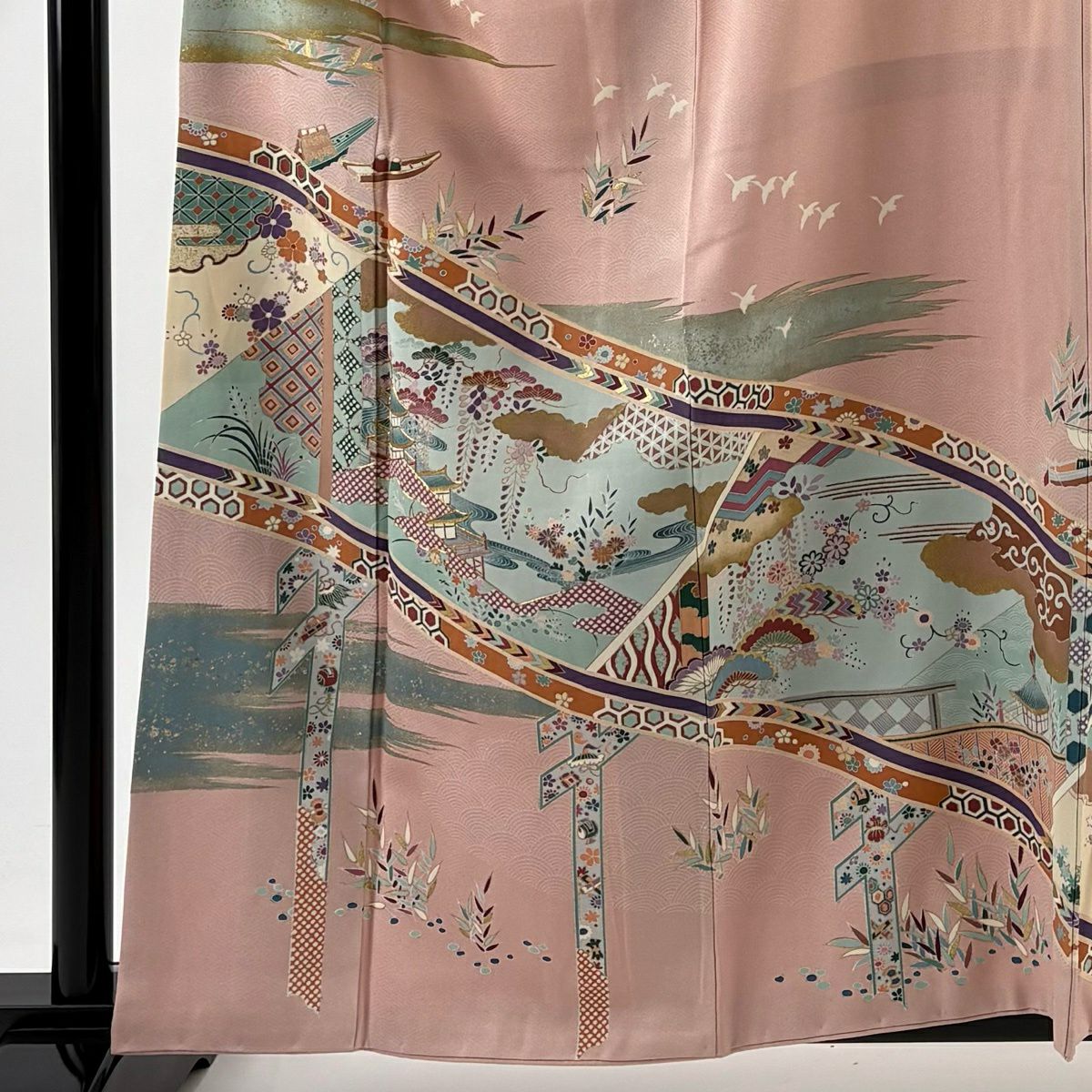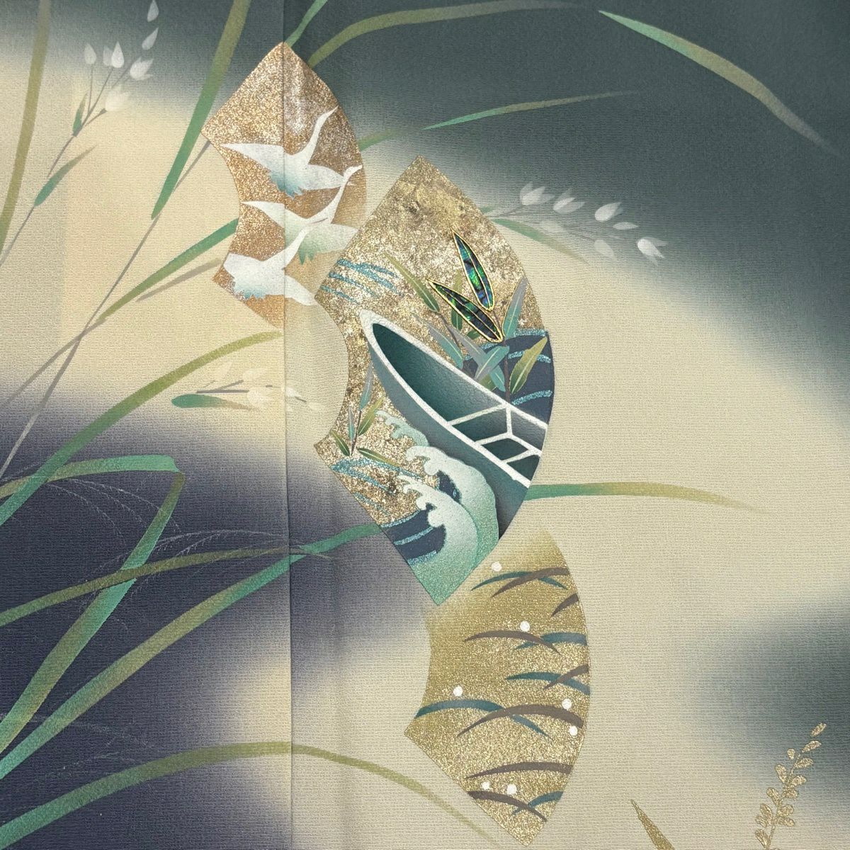 他の画像を見る 【最終値引き】 70%OFF 訪問着 身丈158cm 裄丈63.5cm S 袷 落款あり 舟 鶴 螺鈿 金銀彩 灰緑 正絹 名品 K70 当店通常価格 ¥ 15,800 ¥ 4,700 税込