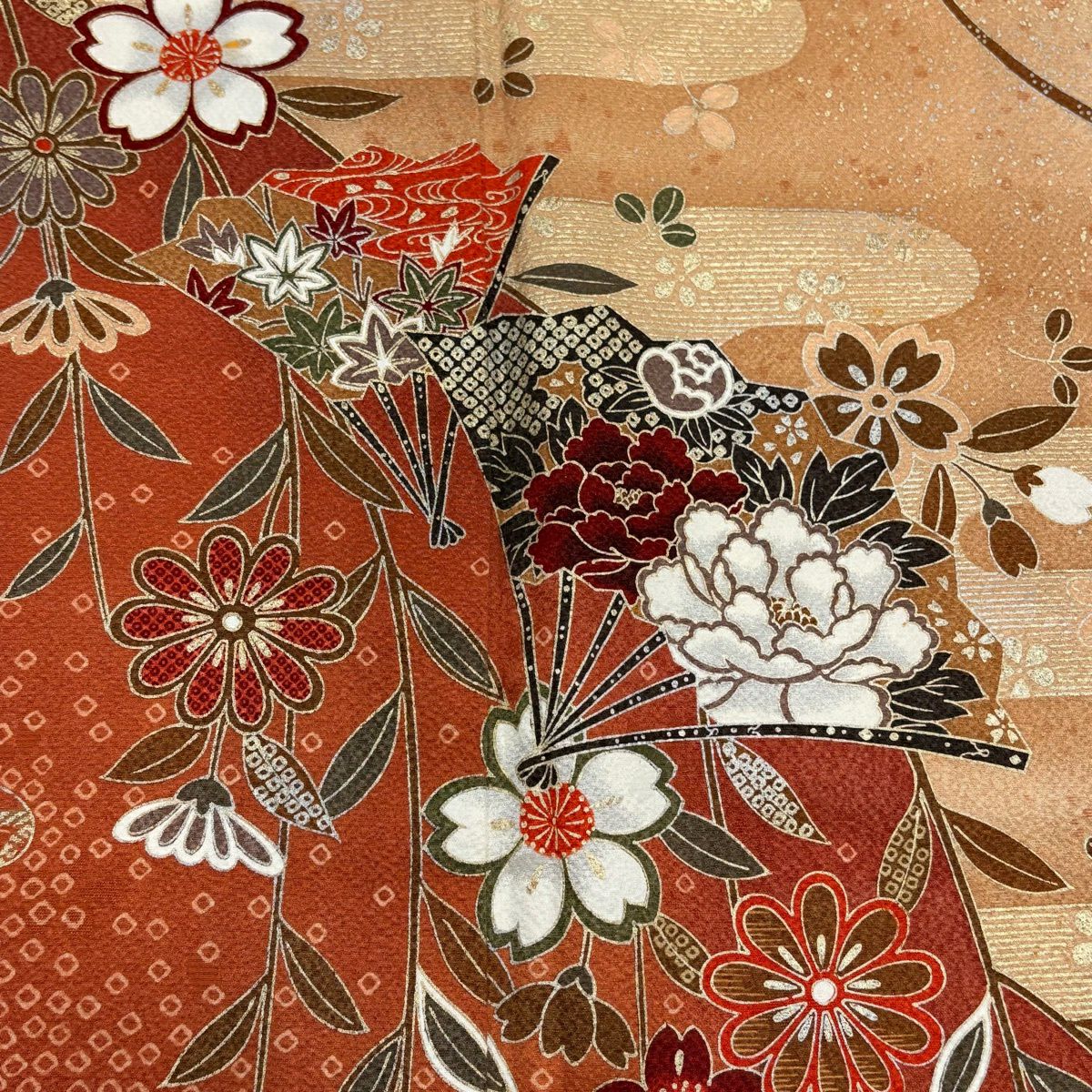 他の画像を見る 【最終値引き】 70%OFF 振袖 身丈155cm 裄丈67cm M 袷 鈴乃屋 扇 草花 金銀彩 染め分け 薄茶色 正絹 名品 K70 当店通常価格 ¥ 13,800 ¥ 4,140 税込
