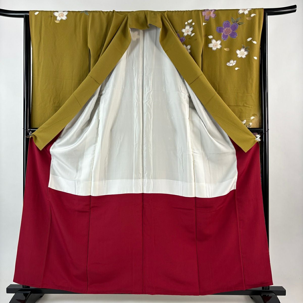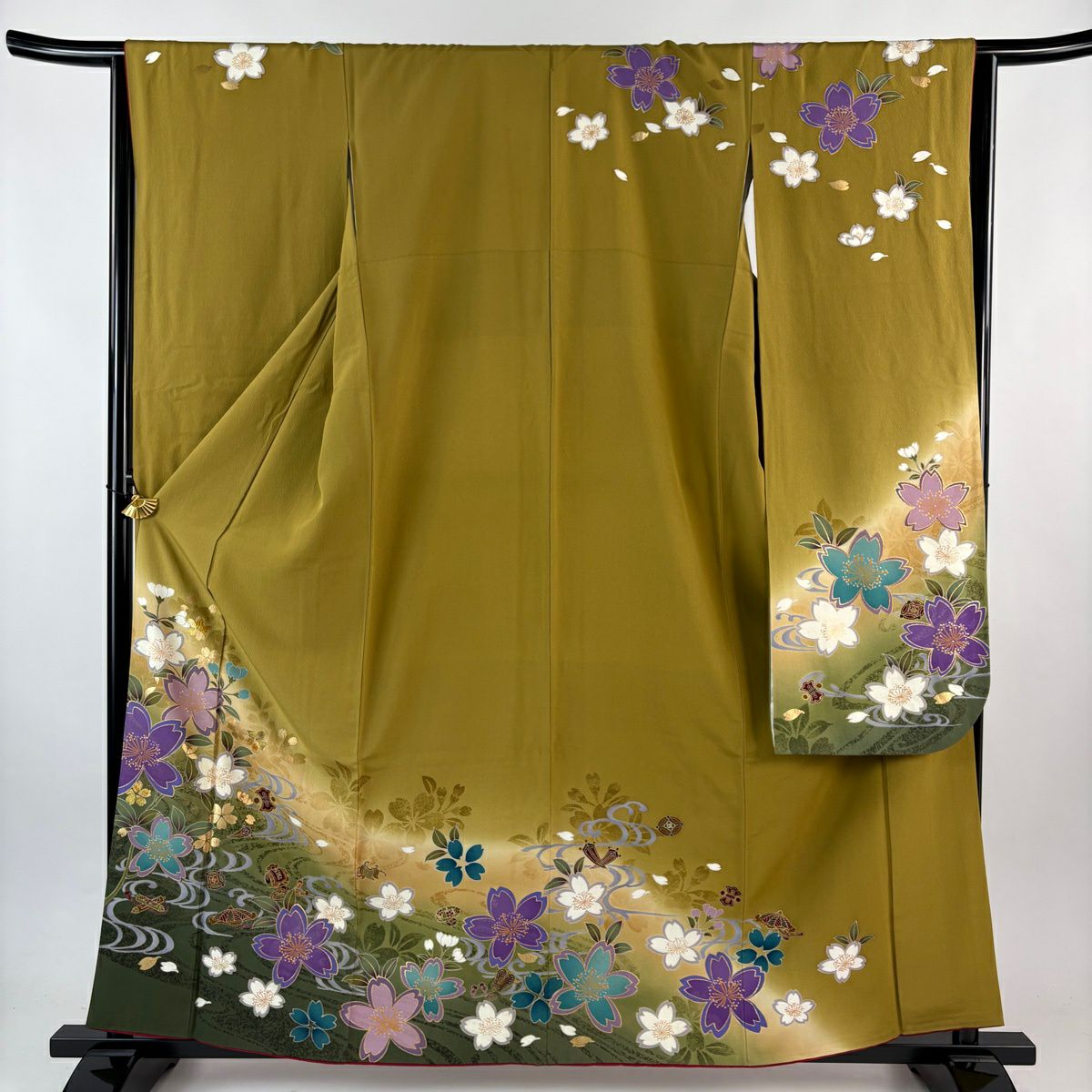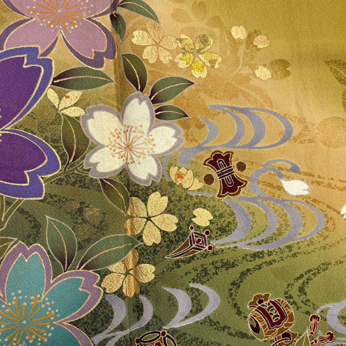 他の画像を見る 【最終値引き】 70%OFF 振袖 身丈160.5cm 裄丈65cm M 袷 鈴乃屋 桜 宝尽くし 金彩 ぼかし 鶯色 正絹 名品 K70 当店通常価格 ¥ 13,800 ¥ 4,140 税込