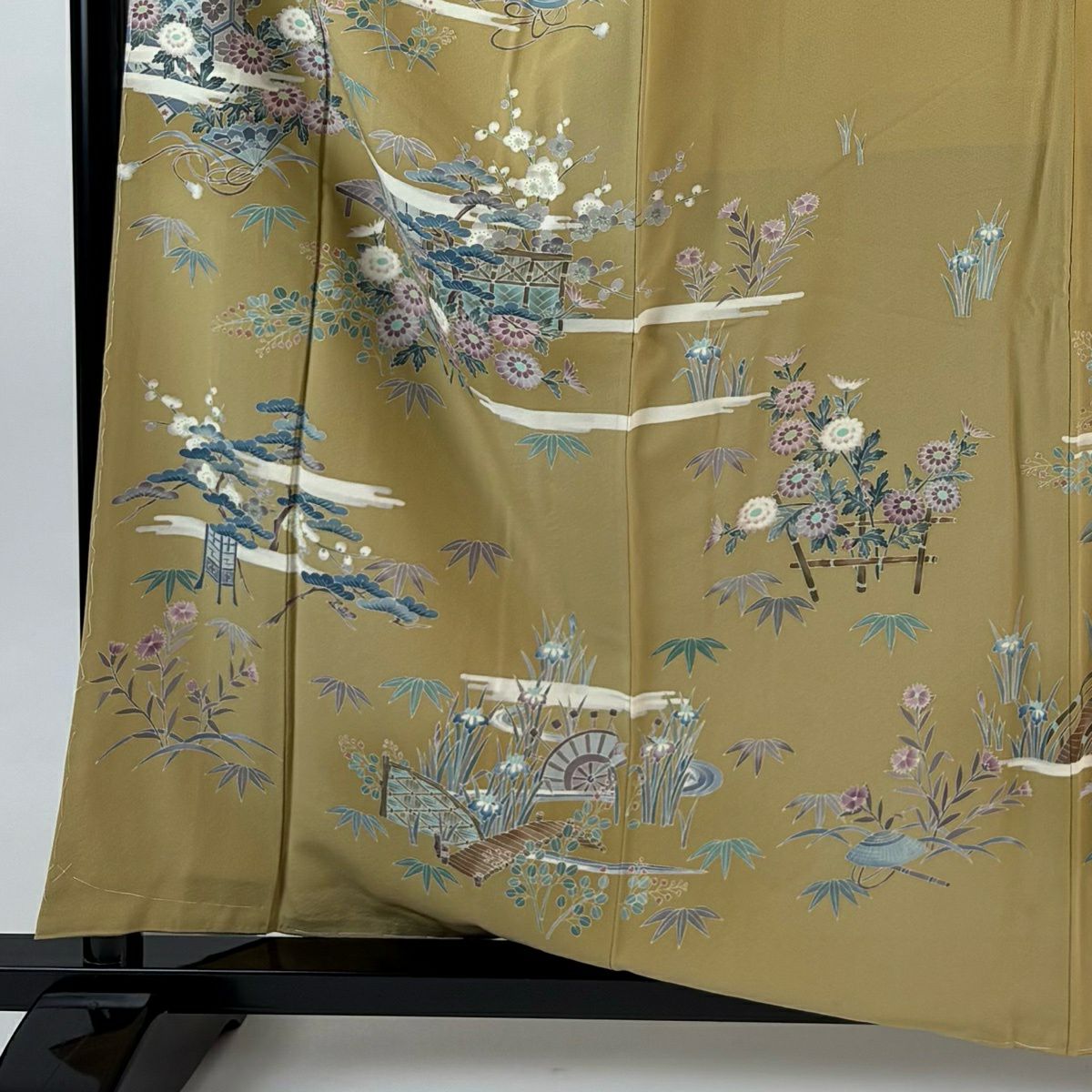 他の画像を見る 【最終値引き】 77%OFF 訪問着 身丈156.5cm 裄丈62cm S 袷 草花 花唐草 螺鈿 金銀彩 山吹茶色 正絹 秀品 K70 当店通常価格 ¥ 8,800 ¥ 1,980 税込
