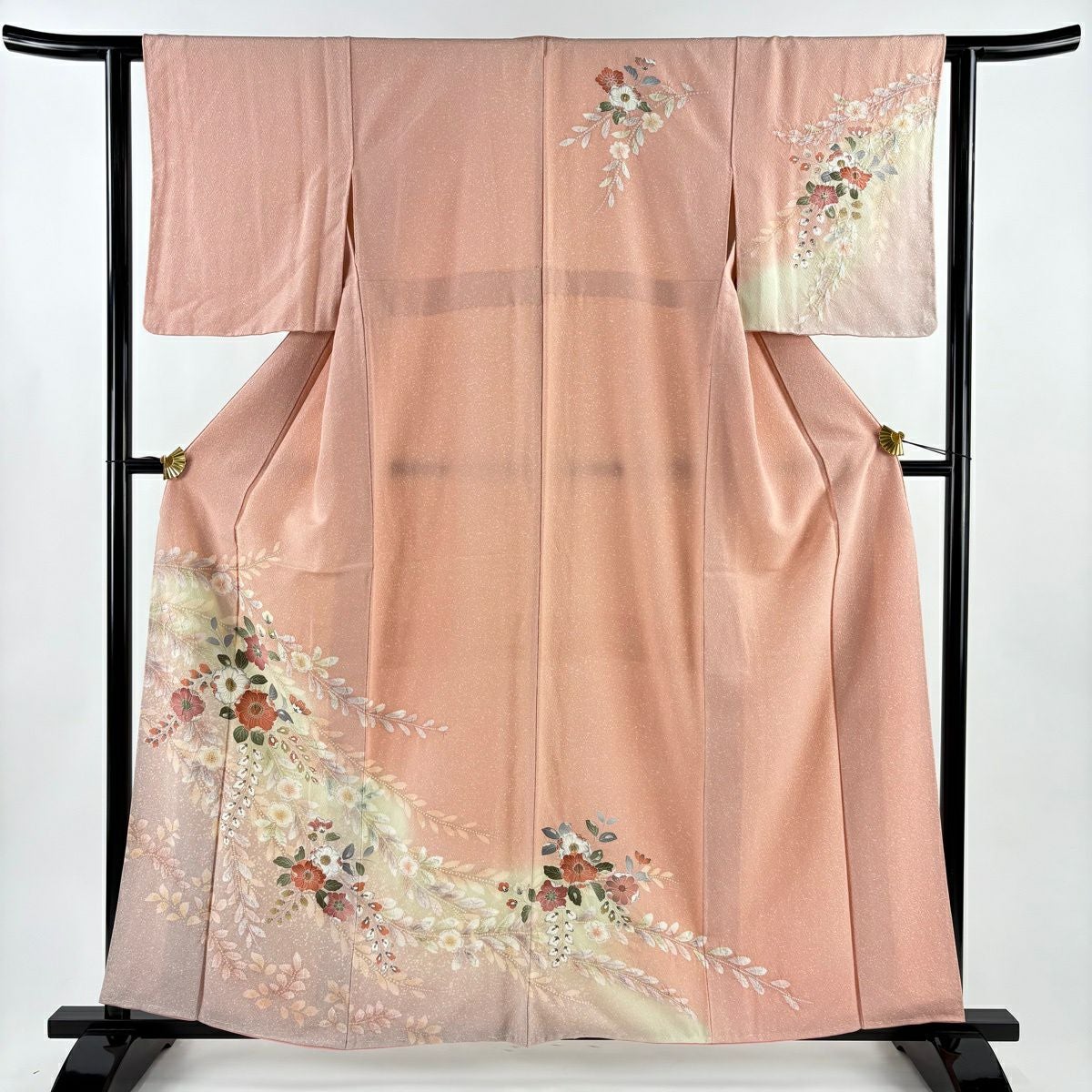 他の画像を見る 【最終値引き】 77%OFF 訪問着 身丈164.5cm 裄丈65.5cm M 袷 枝花 霞 金彩 絞り サーモンピンク 正絹 秀品 K70 当店通常価格 ¥ 8,800 ¥ 1,980 税込