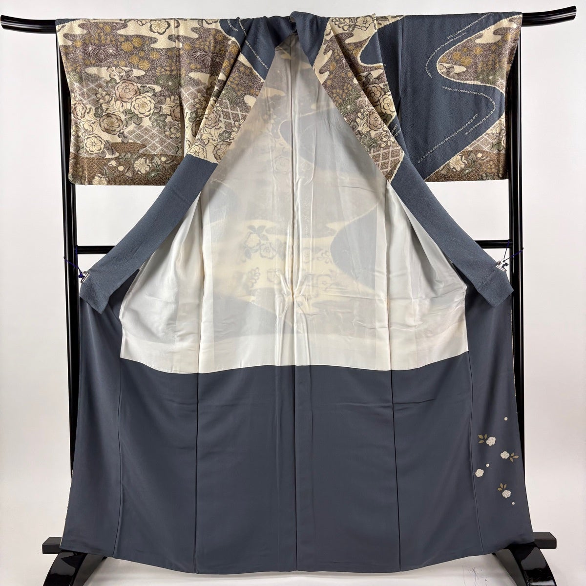 訪問着 身丈161cm 裄丈66cm M 袷 舟 草花 金彩 灰緑 正絹 秀品