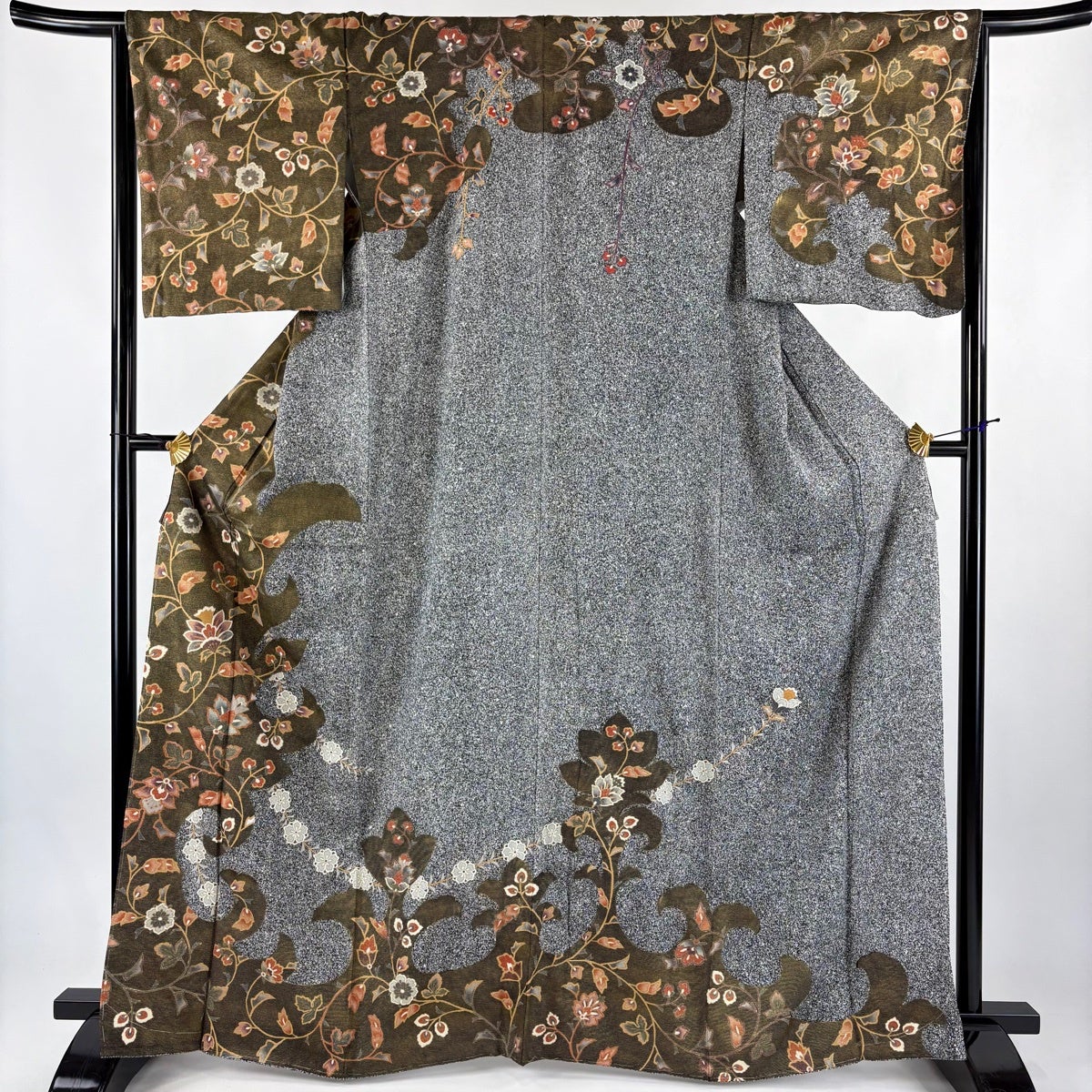 紬 身丈159.5cm 裄丈65cm M 袷 葡萄唐草 草花 焦茶色 正絹 名品