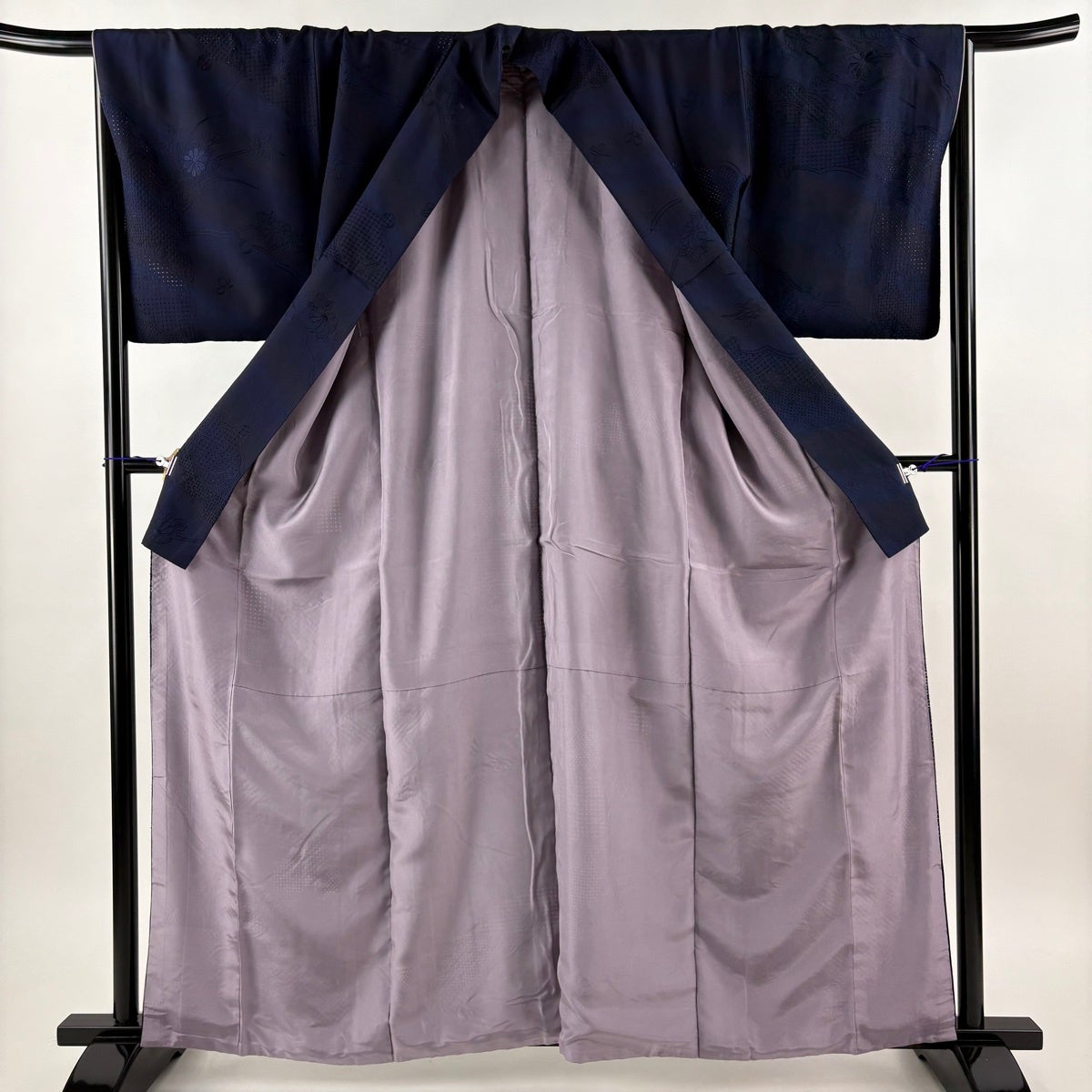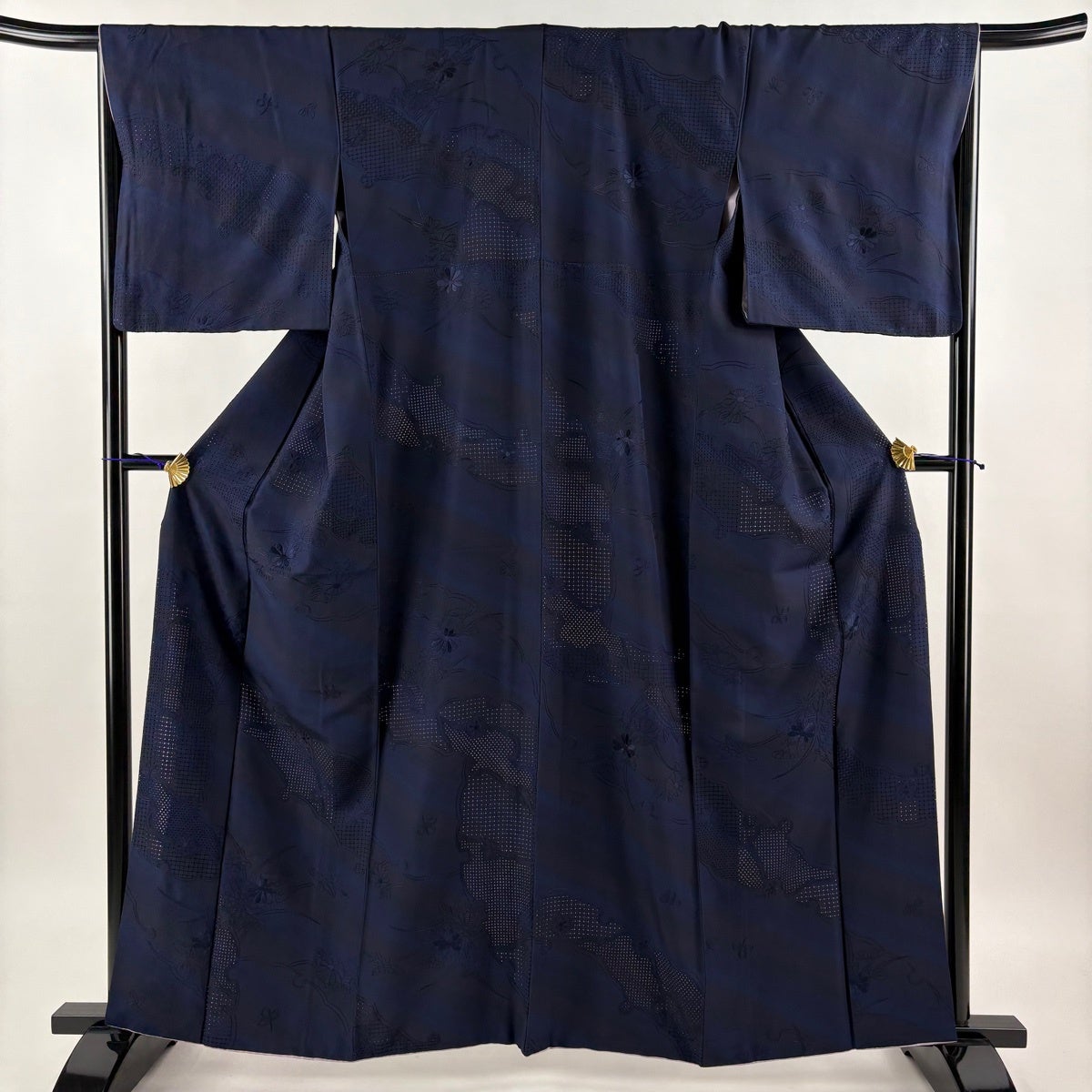 小紋 身丈163cm 裄丈67cm M 袷 雪輪 草花 刺繍 ぼかし 紺色 正絹 逸品