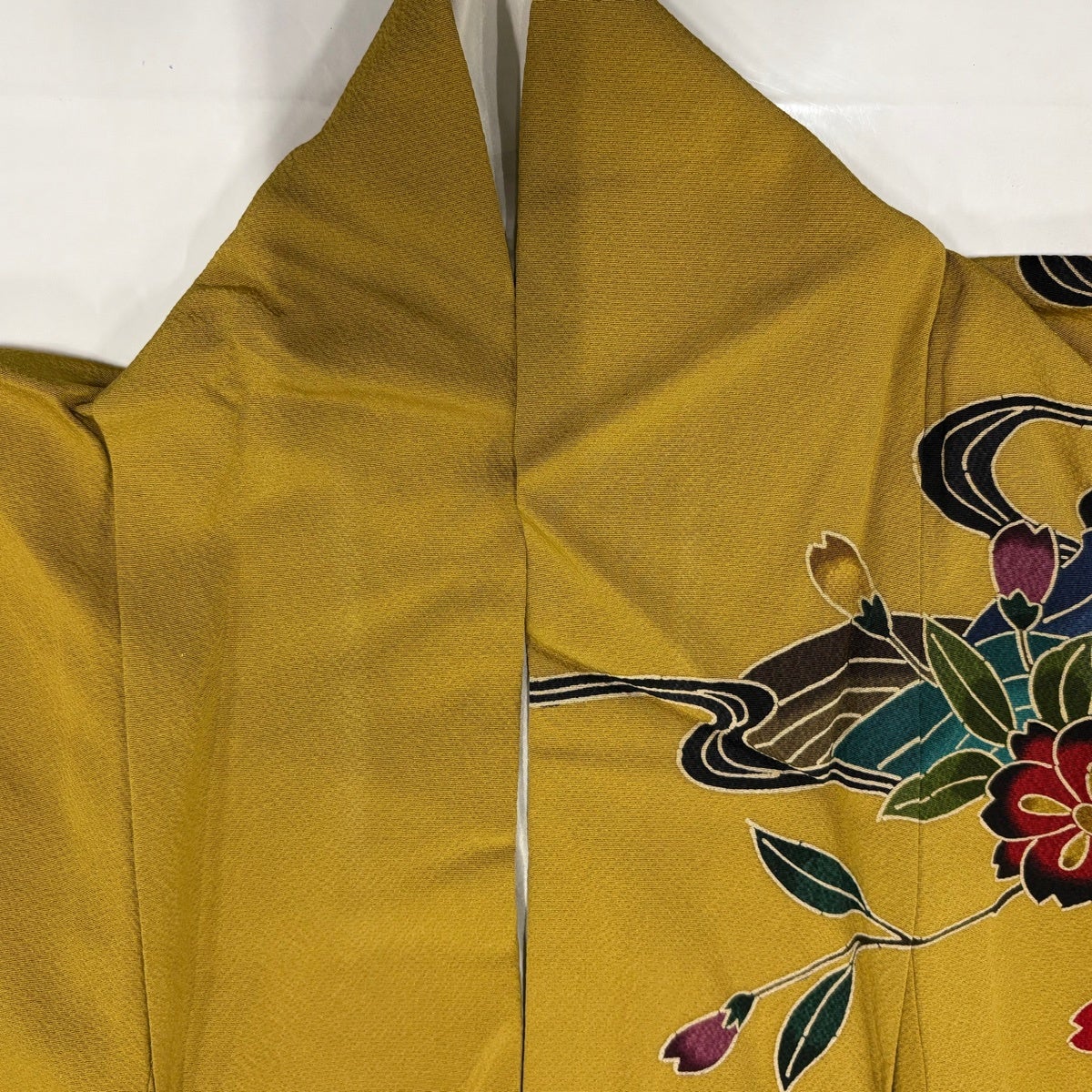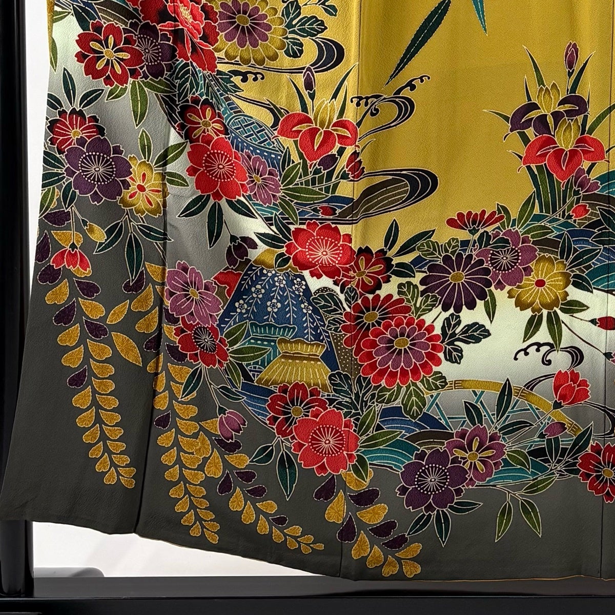 振袖 身丈156cm 裄丈62.5cm S 袷 草花 波 ぼかし 山吹茶色 正絹 名品