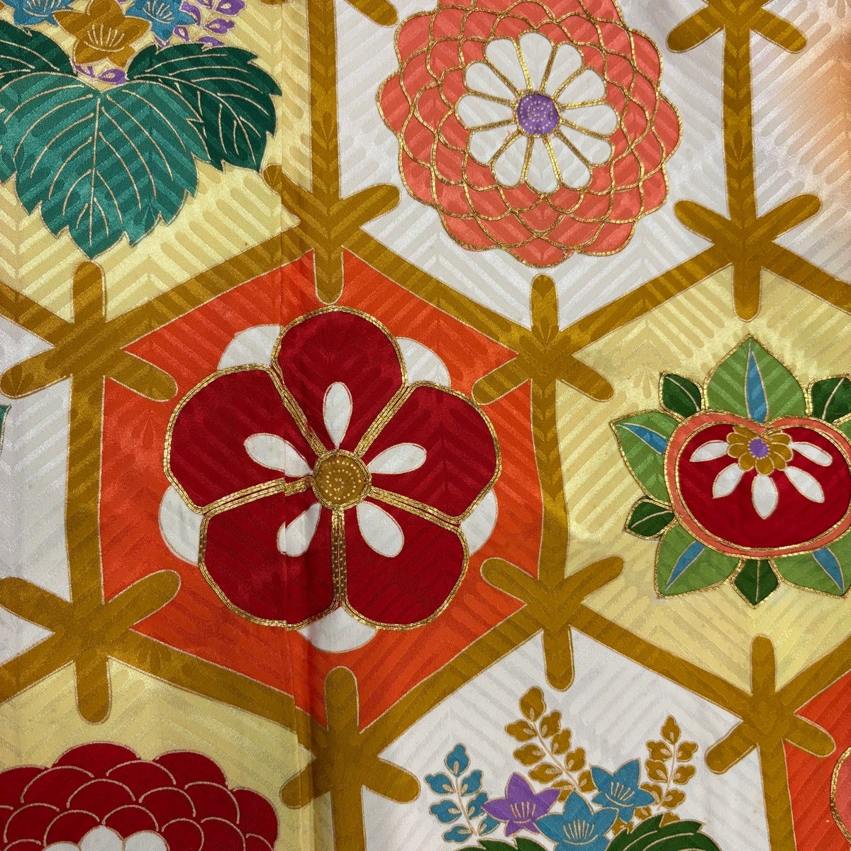 振袖 身丈154cm 裄丈63.5cm S 袷 梅 菊 金糸 金彩 オレンジ 正絹 秀品
