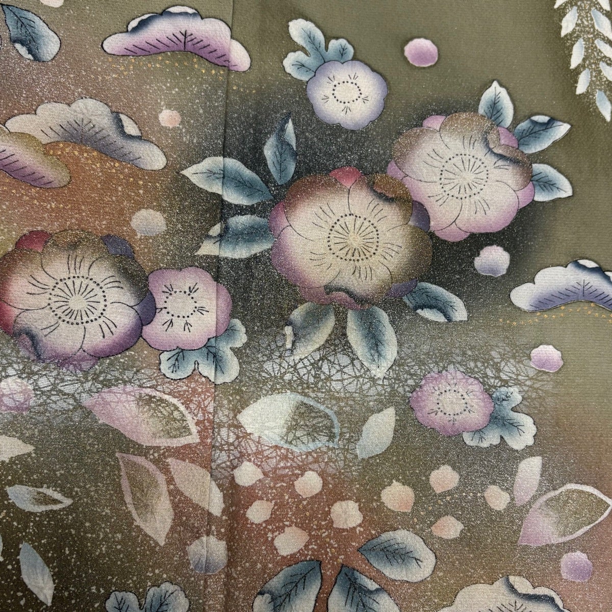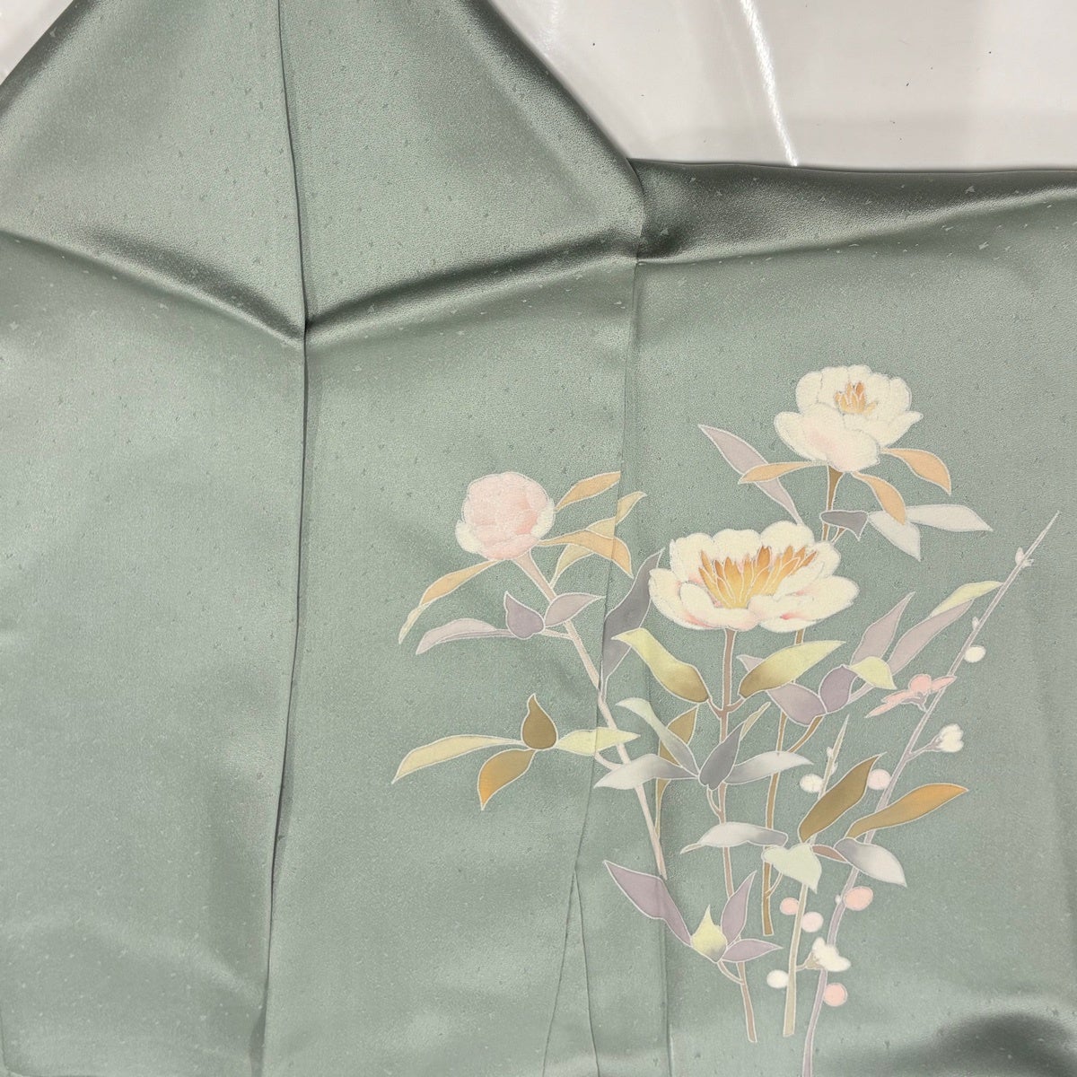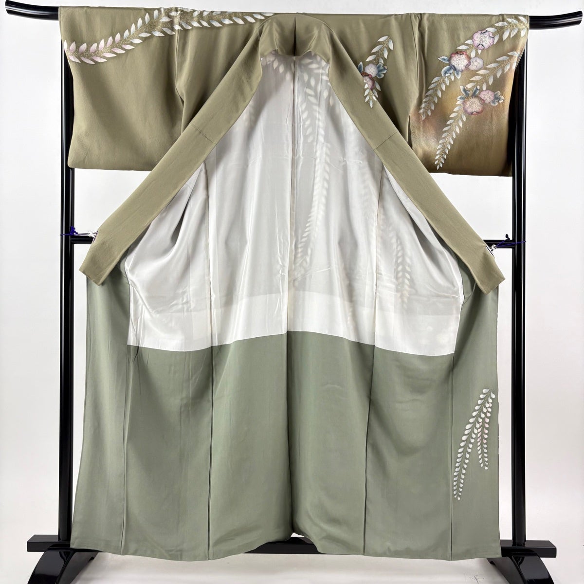 訪問着 身丈159.5cm 裄丈68cm L 袷 草花 金銀彩 ぼかし 灰緑 正絹 秀品