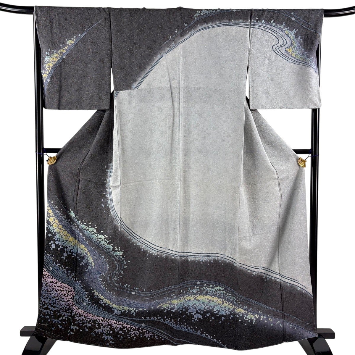 訪問着 身丈162cm 裄丈64cm M 袷 辻が花 金銀彩 染め分け 灰色 正絹 秀品