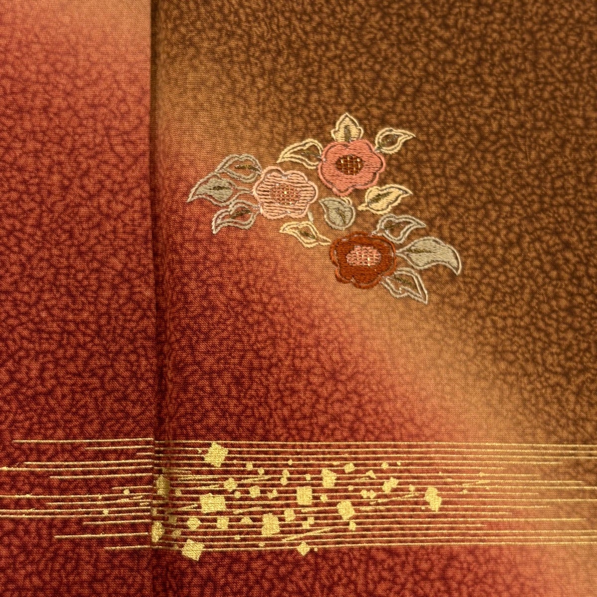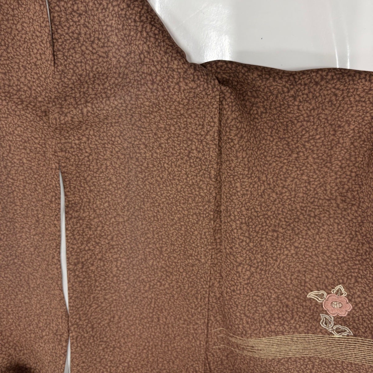 付下げ 身丈156.5cm 裄丈63.5cm S 袷 草花 霞 刺繍 金彩 茶色 正絹 秀品