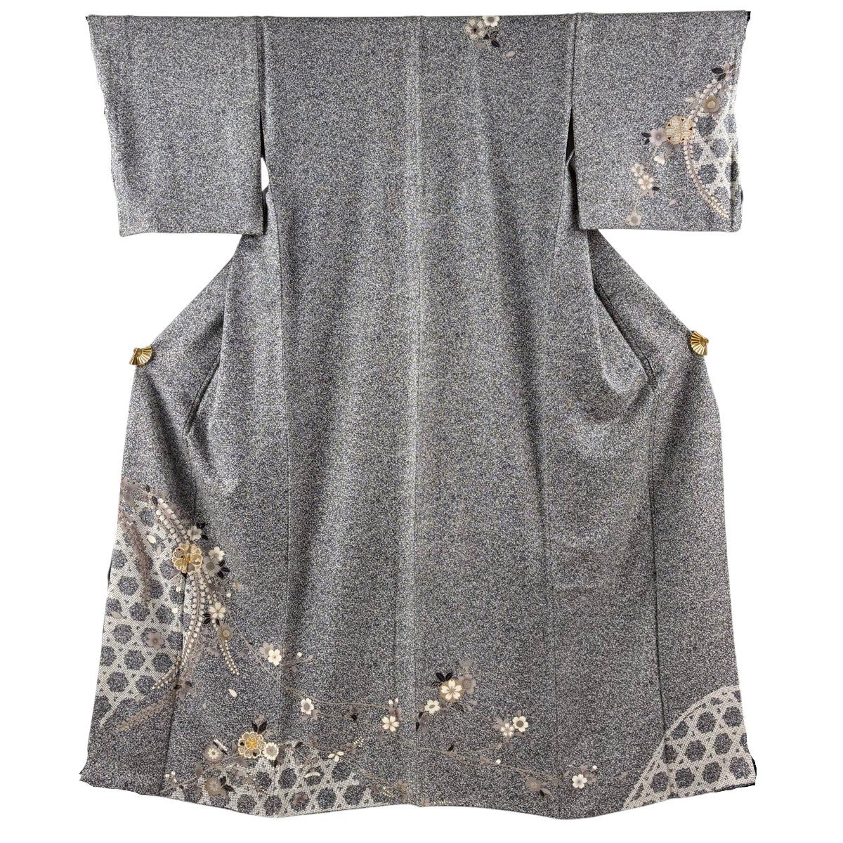 訪問着 身丈165.5cm 裄丈68cm L 袷 草花 籠目 金糸 金彩 黒灰 正絹 秀品
