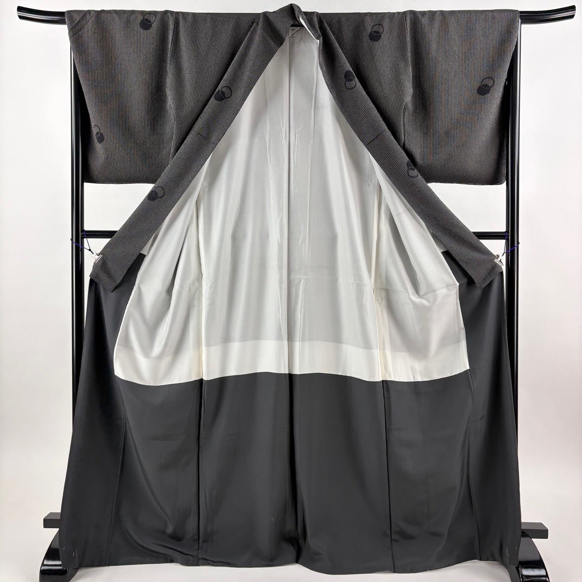 塩沢紬 身丈171.5cm 裄丈67.5cm L 袷 塩沢絣 証紙あり 縞 輪 黒灰 正絹 名品