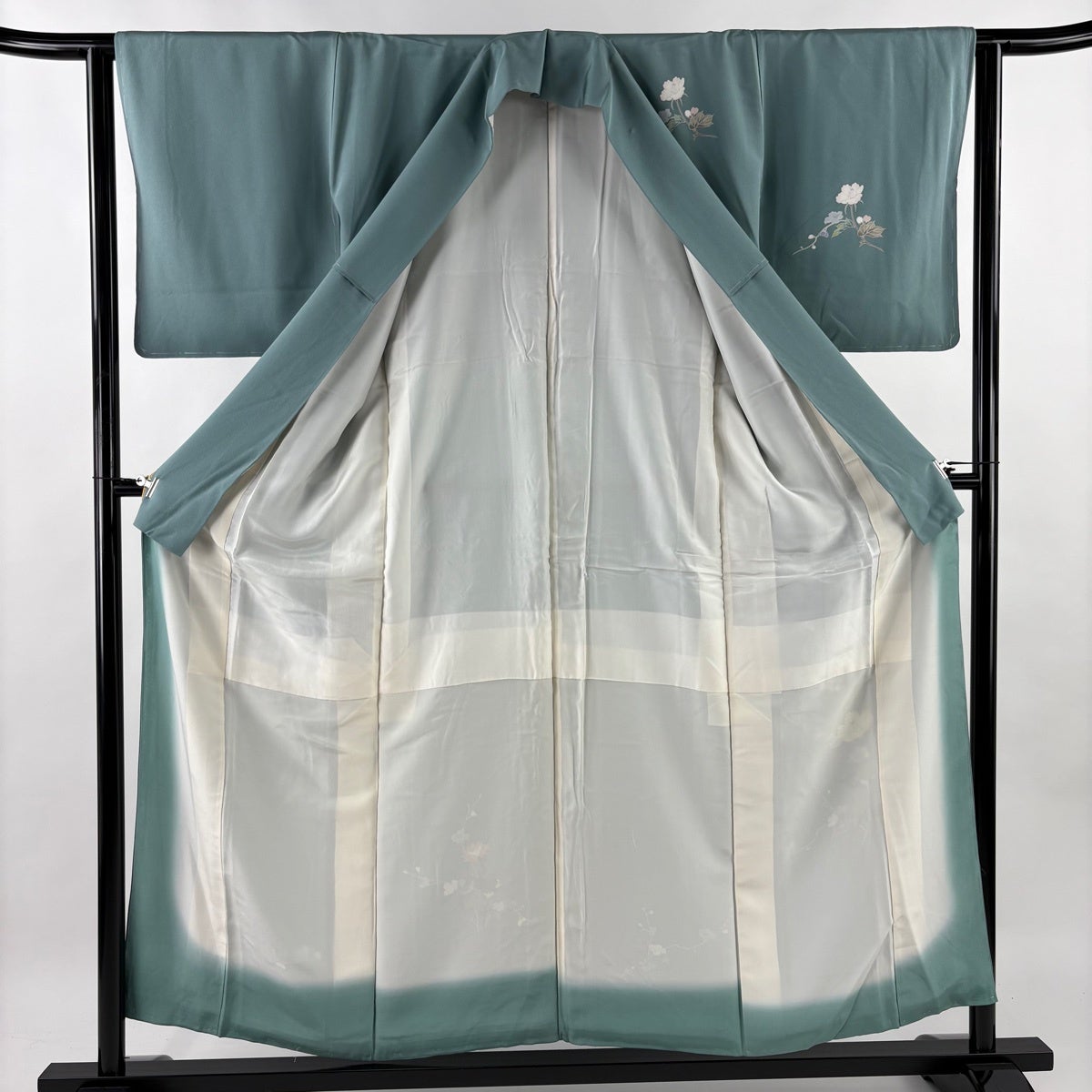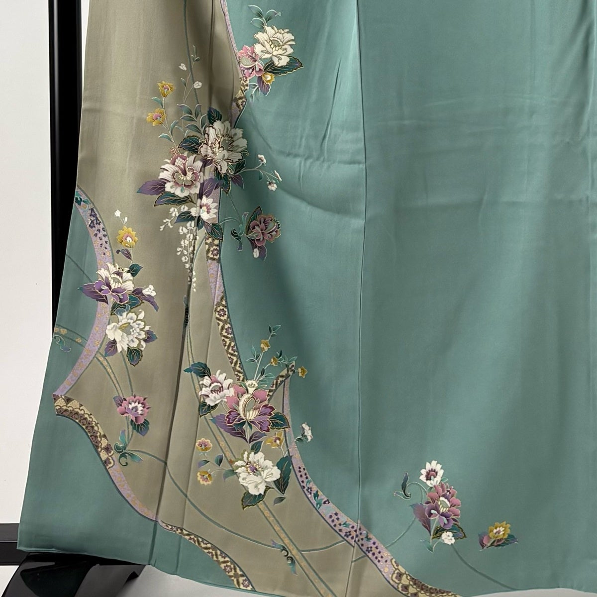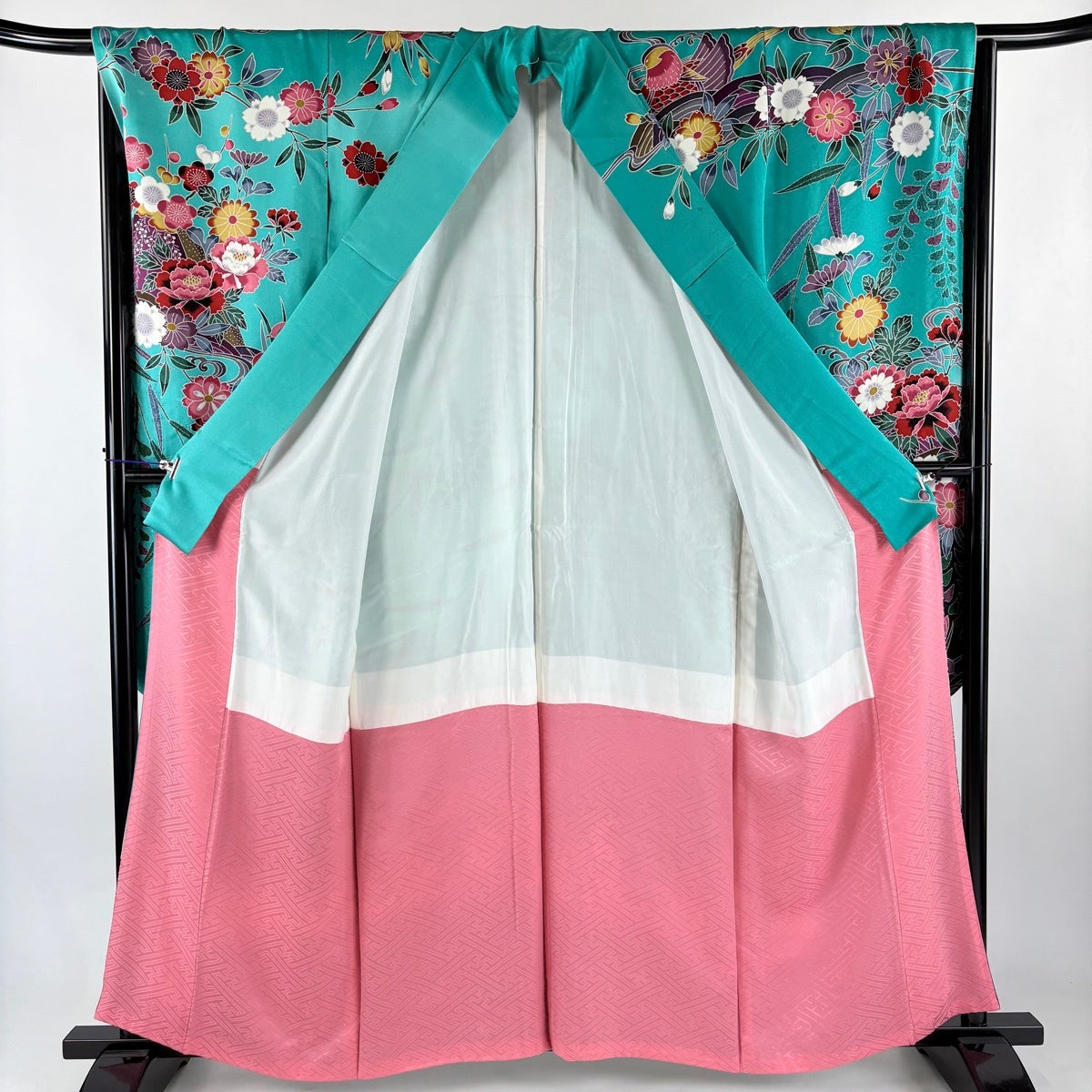 振袖 身丈159cm 裄丈70cm L 袷 牡丹 桜 染め分け ぼかし 青緑 正絹 名品