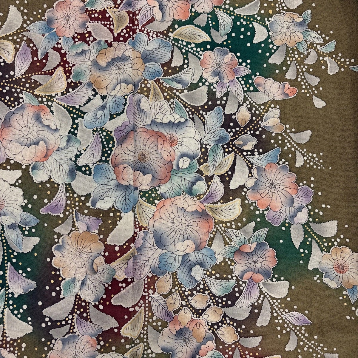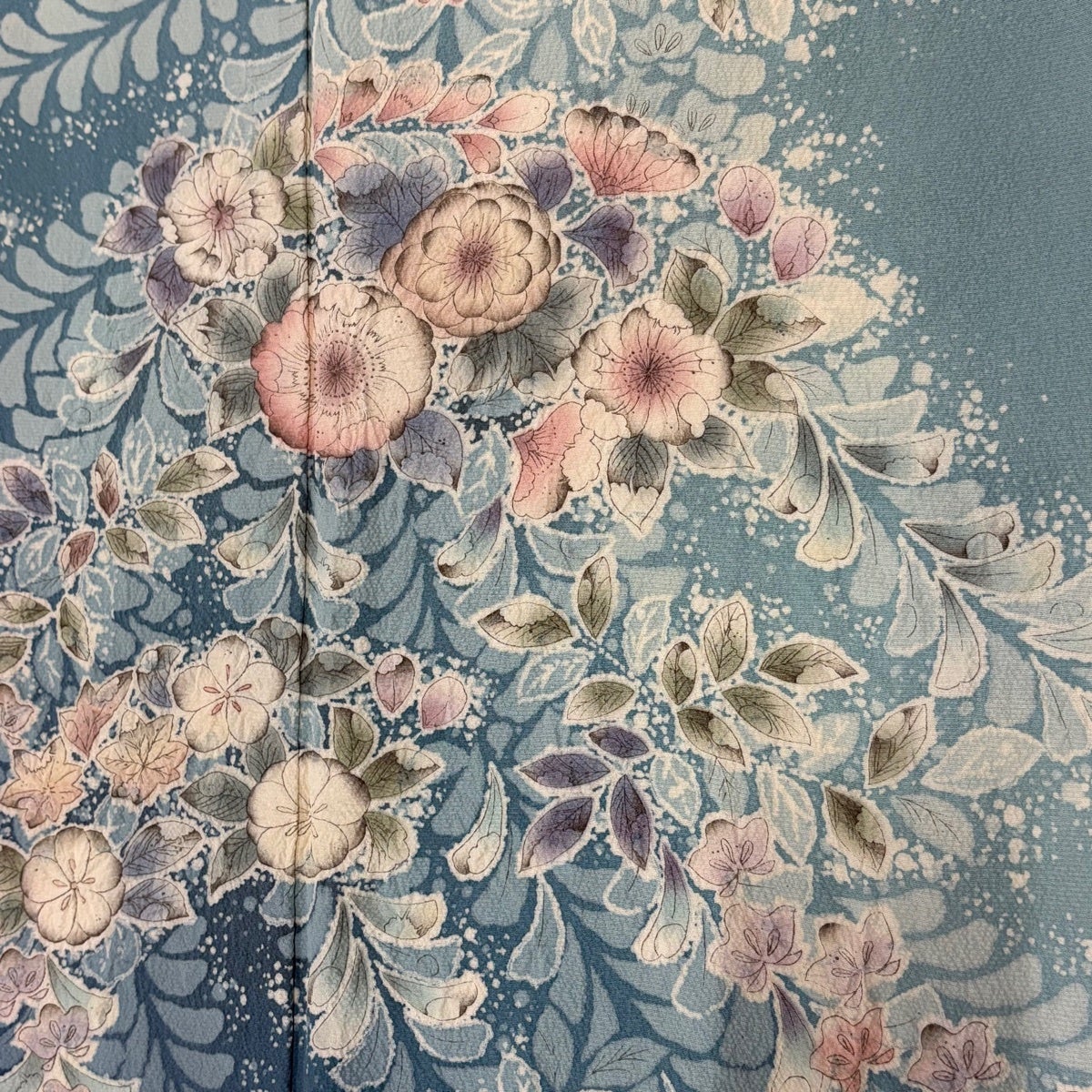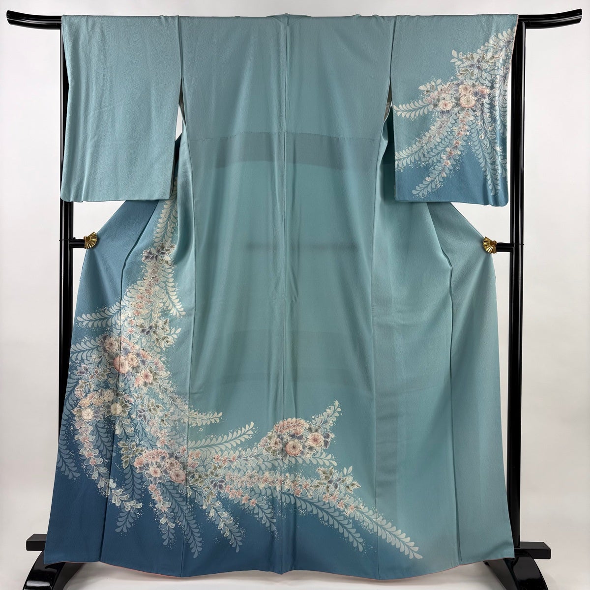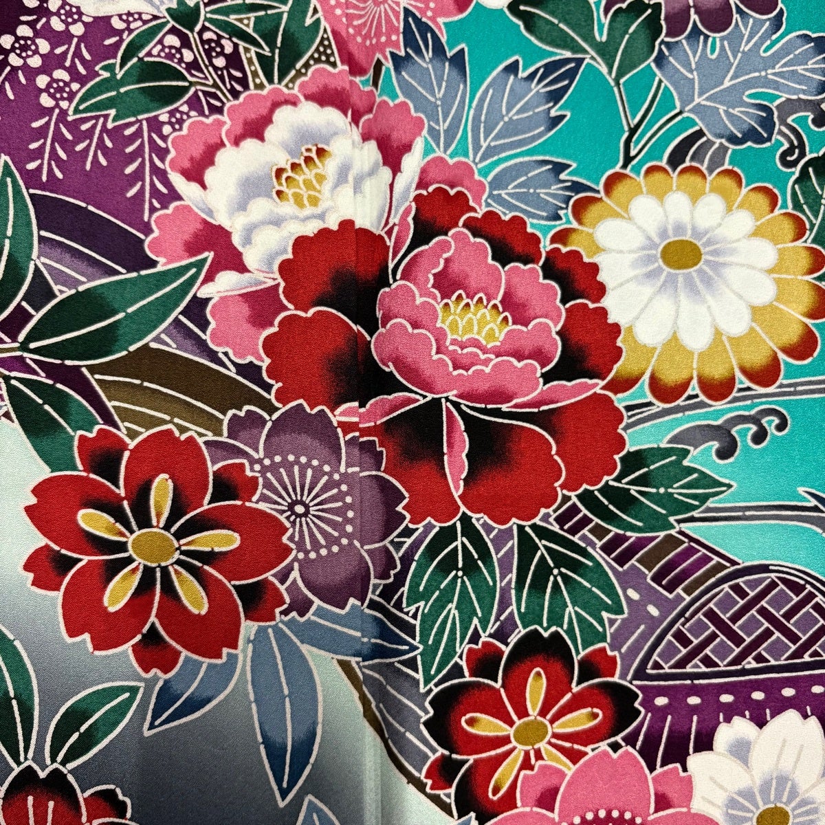 振袖 身丈159cm 裄丈70cm L 袷 牡丹 桜 染め分け ぼかし 青緑 正絹 名品