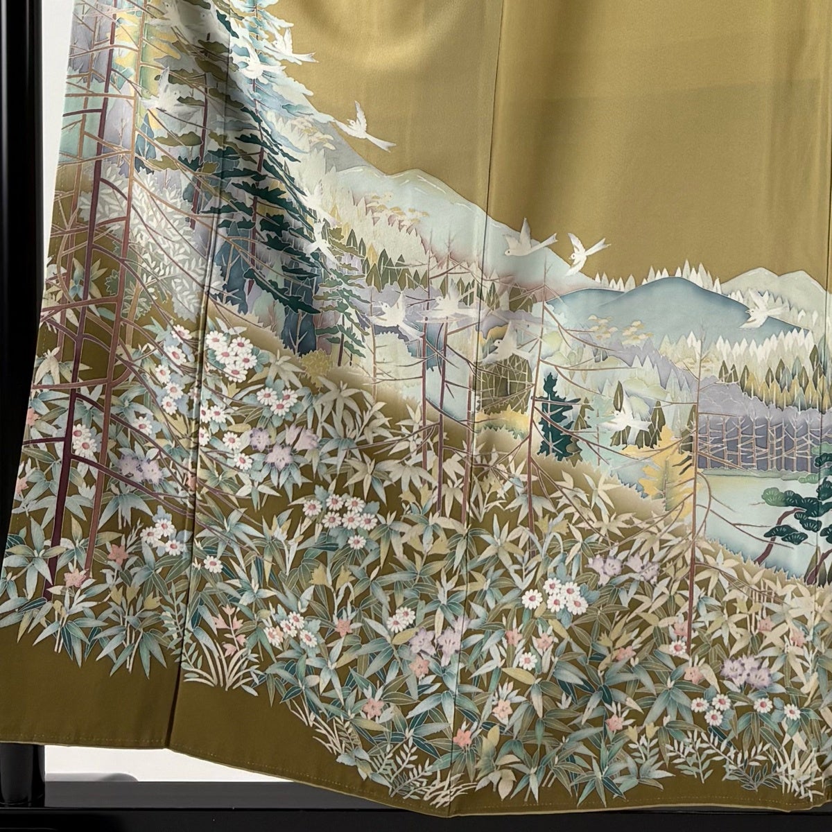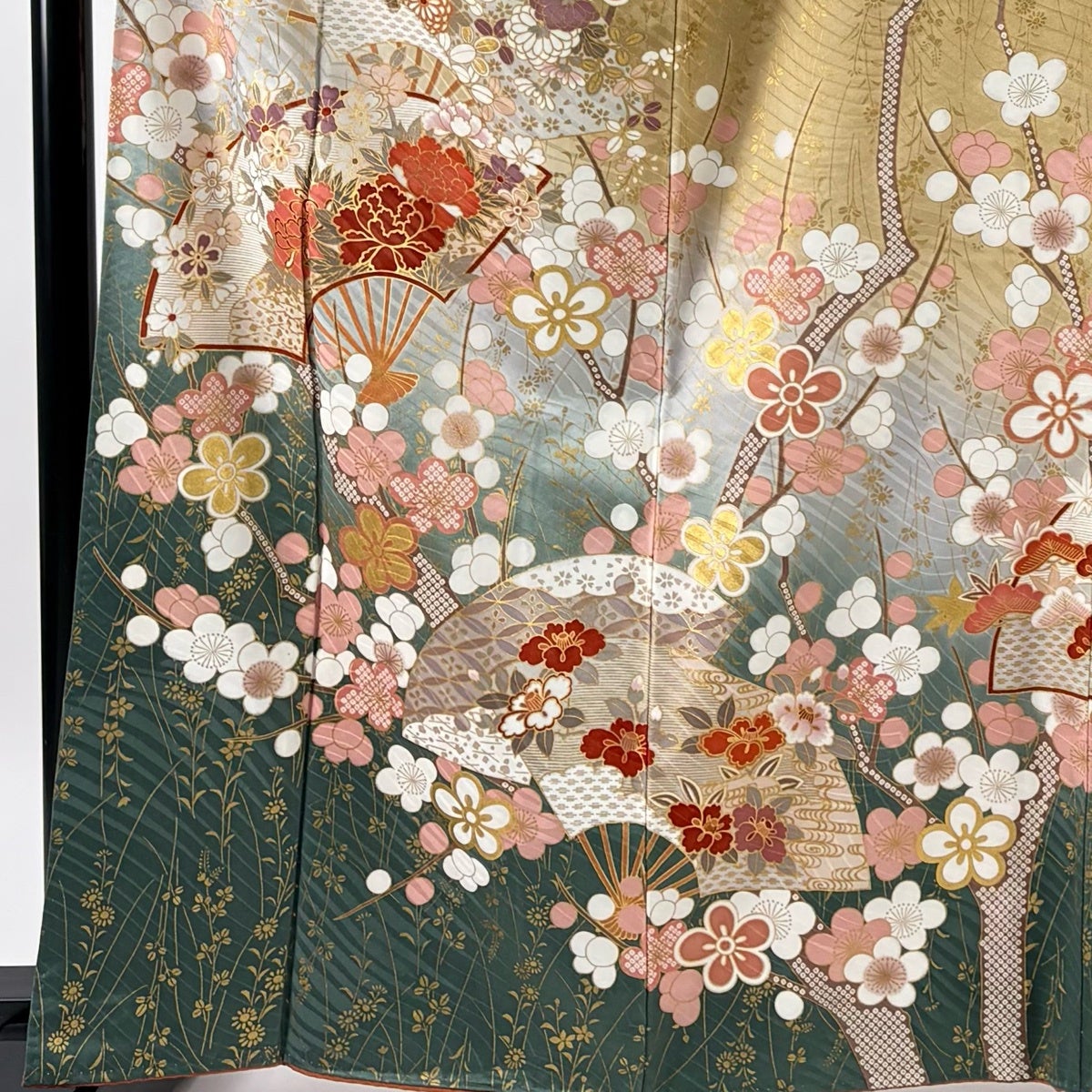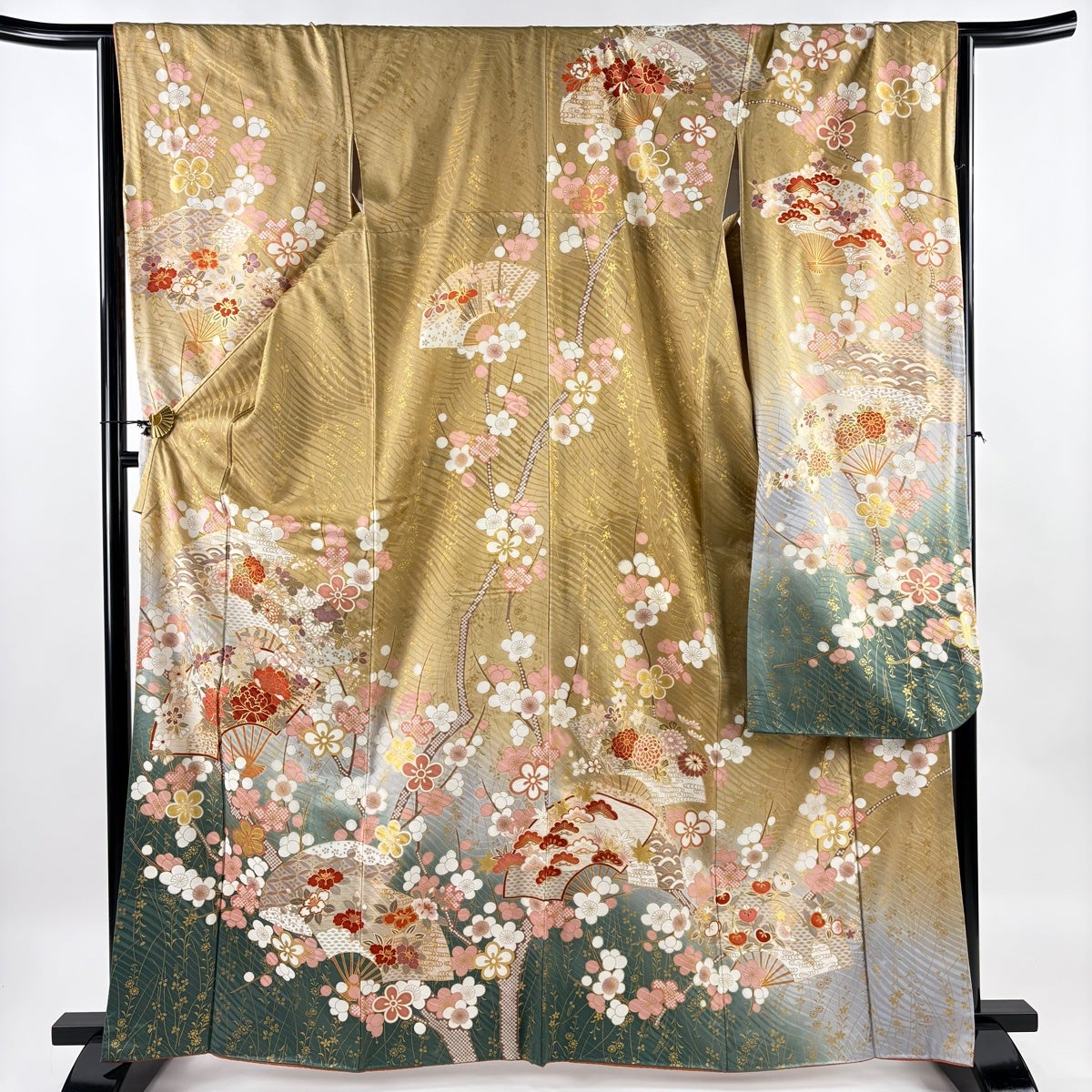【美品】 振袖 身丈165cm 裄丈66cm M 袷 花扇 梅 金彩 黄土色 正絹 名品