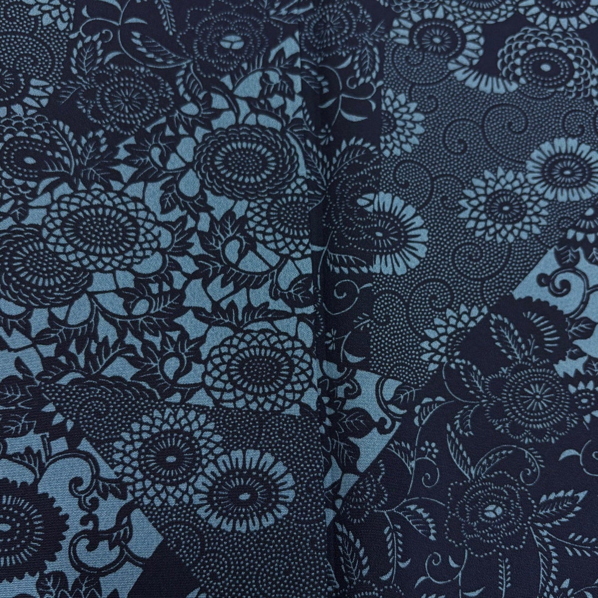 小紋 身丈159.5cm 裄丈67cm M 袷 やまと 菊唐草 寄せ柄 藍色 正絹 秀品