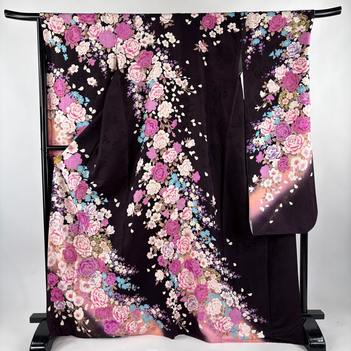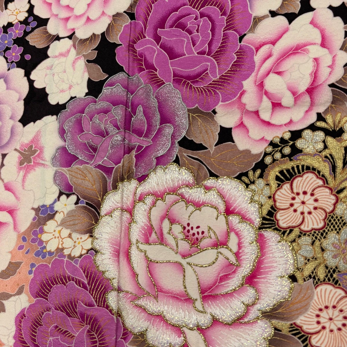 振袖 身丈169cm 裄丈69.5cm L 袷 薔薇 桜 刺繍 金銀彩 茶紫 正絹 名品