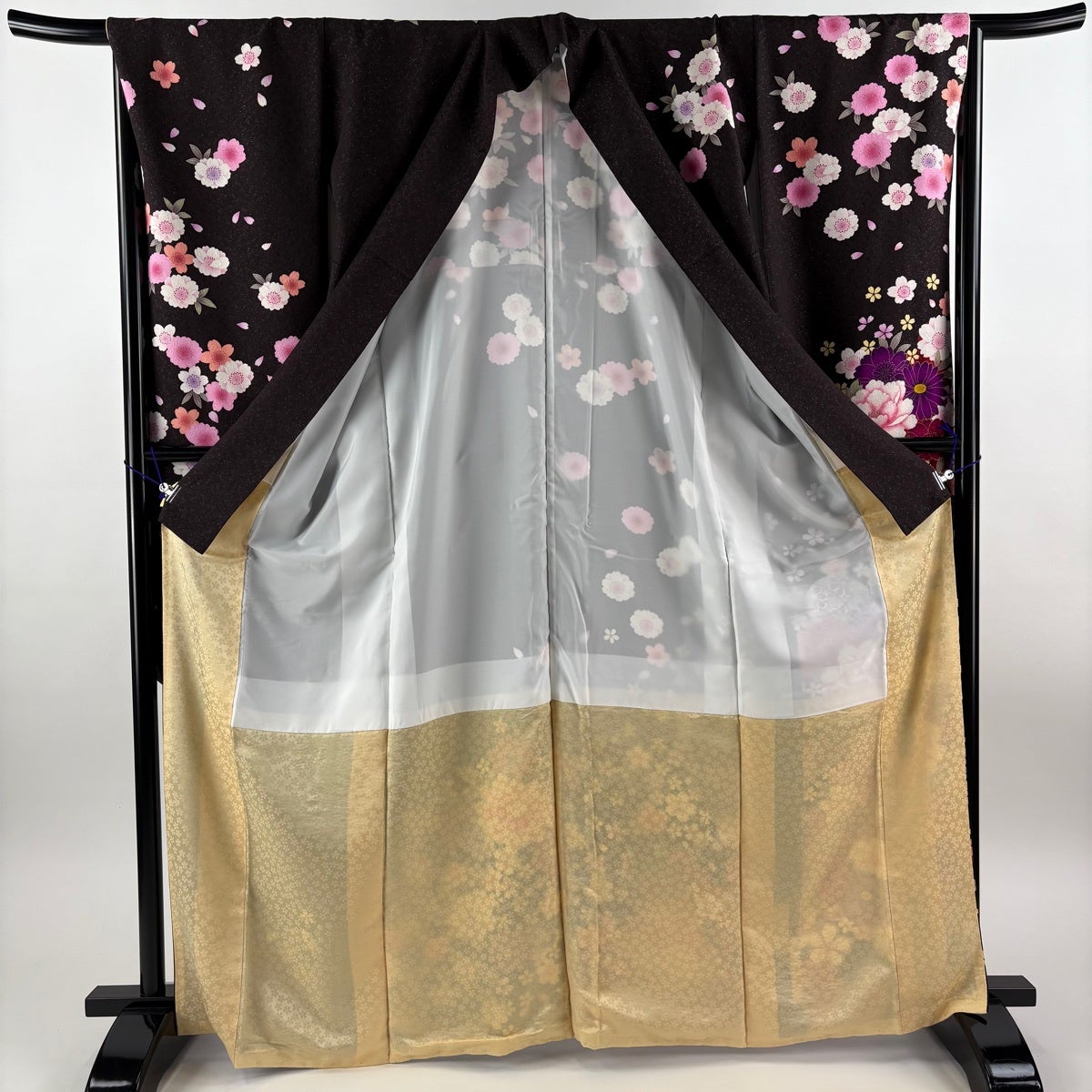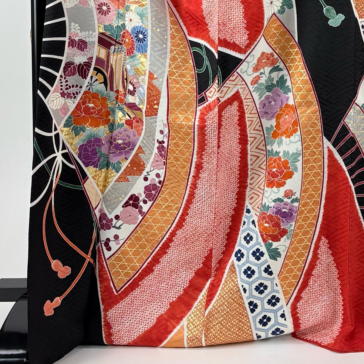 振袖 身丈172cm 裄丈69.5cm L 袷 御所車 草花 金糸 絞り 黒 正絹 秀品