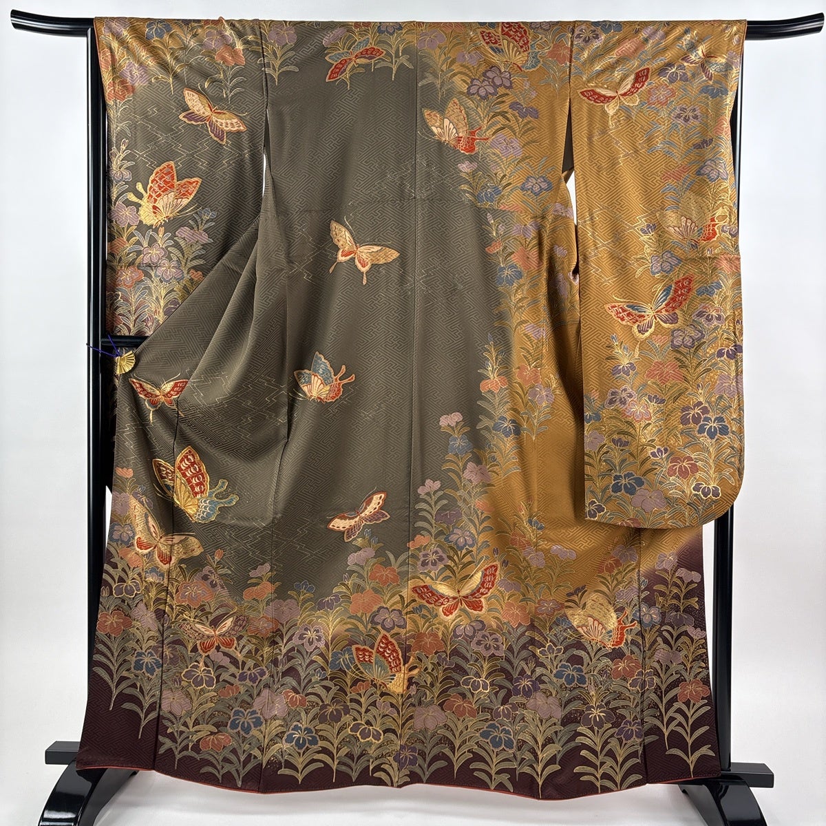 振袖 身丈163.5cm 裄丈66cm M 袷 蝶 草花 金糸 金銀彩 茶緑色 正絹 秀品
