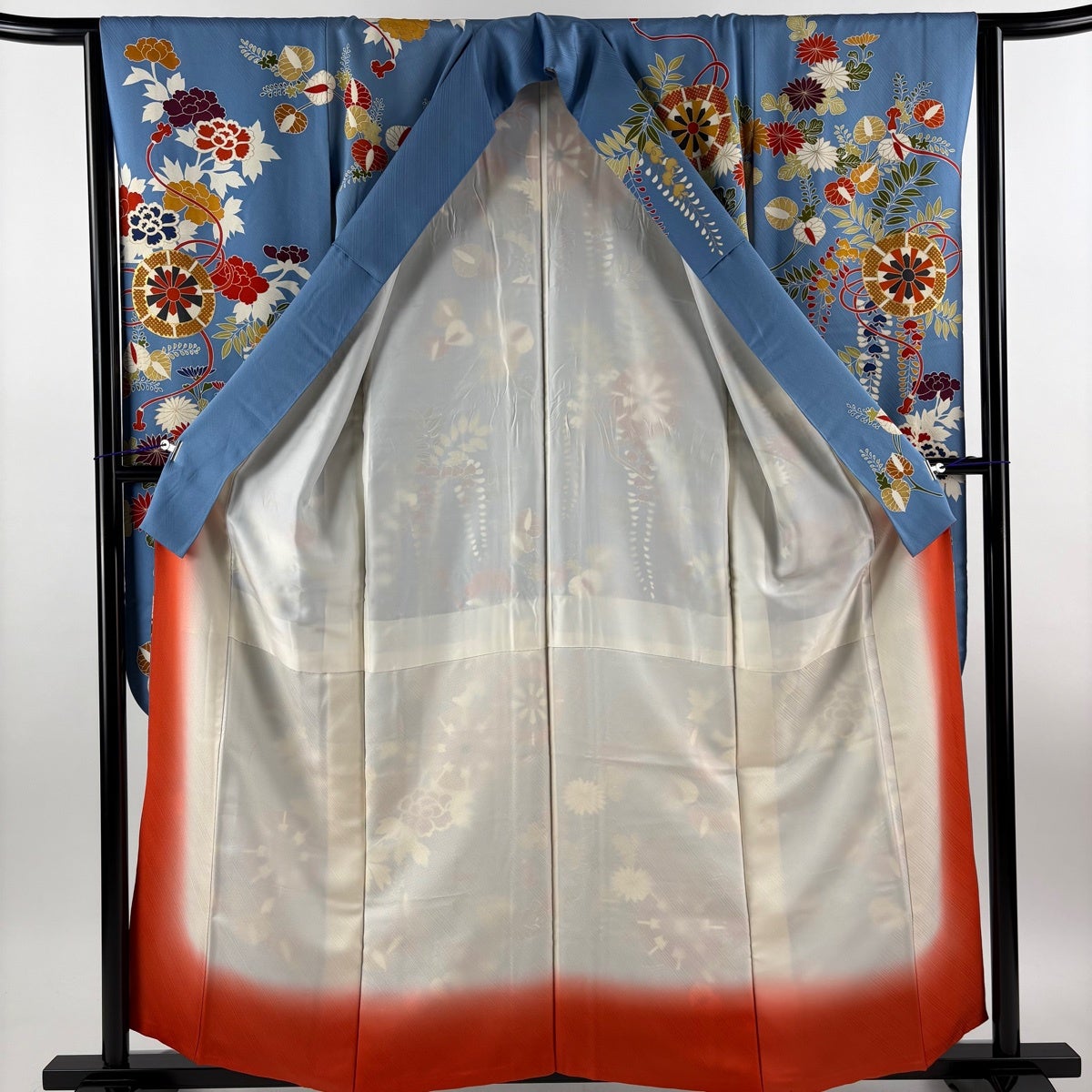 振袖 身丈159cm 裄丈63cm S 袷 牡丹 流水 染め分け 赤 正絹 名品